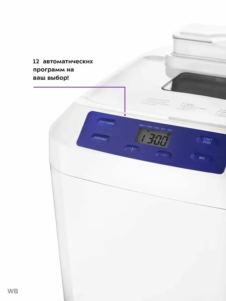 | Программы | бородинский хлеб / ржаной хлеб / сладкая выпечка / Быстрый хлеб / Выпечка / Дрожжевое тесто / Замес с изменением времени / Запекание / Итальянский хлеб / Классический хлеб / Мультиповар / Отложенный старт / Хлеб на закваске |