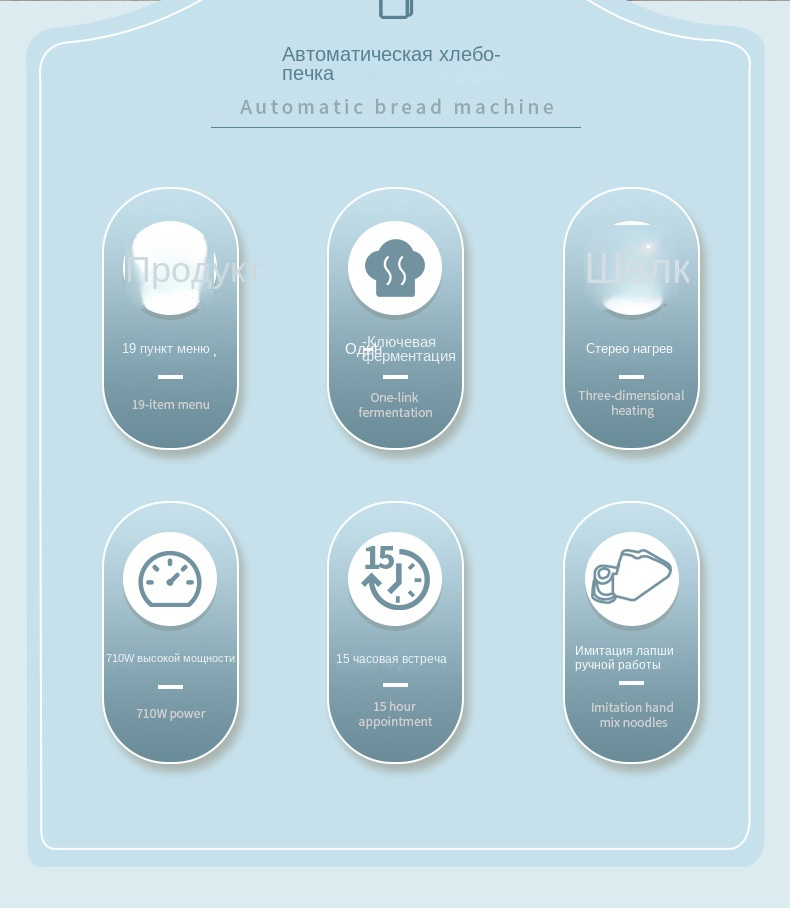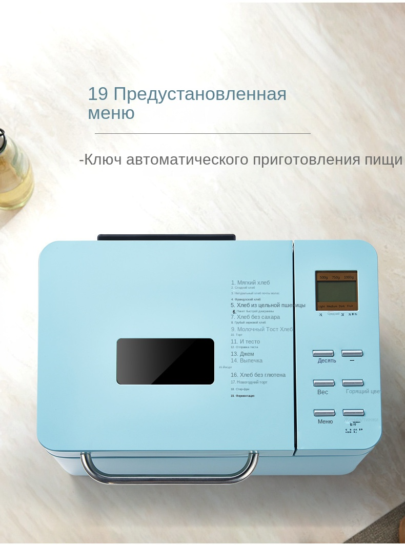 | Программы | варенье / замес теста / йогурт / кекс / сладкая выпечка / Быстрый хлеб / Мягкий хлеб / Натуральный ферментированный хлеб / Обжаривать во фритюре / Рисовый пирог / сладкий хлеб / Ферментированное тесто / Французский хлеб / Хлеб без глютена / Хлеб без сахара / Хлеб для тостов с молоком / Хлеб из цельного зерна / Хлеб из цельнозерновой муки / выпекать / ферментация |