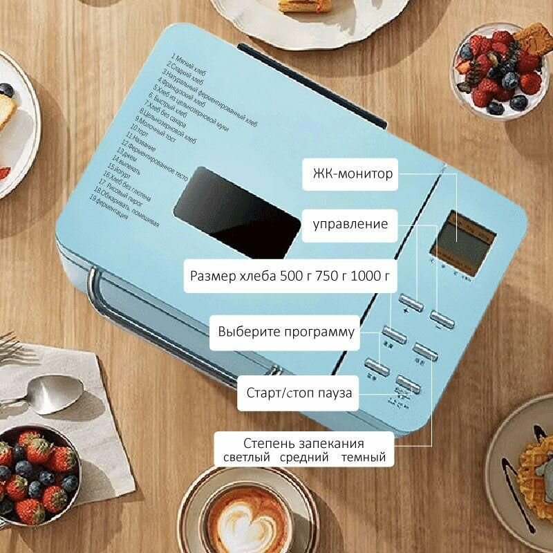 | Программы | варенье / замес теста / йогурт / ржаной хлеб / сладкая выпечка / Безглютеновый хлеб / Бисквит / Брожение / Быстрый хлеб / Дрожжевое тесто / Замес с изменением времени / Классический хлеб / Молочный хлеб / Мультизерновой хлеб / Мягкий хлеб / Отложенный старт / Пирог / Поддержание тепла / сладкий хлеб / Французский хлеб / Хлеб на закваске / Цельнозерновой хлеб |