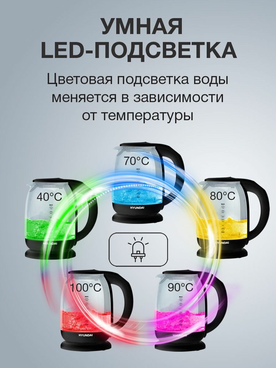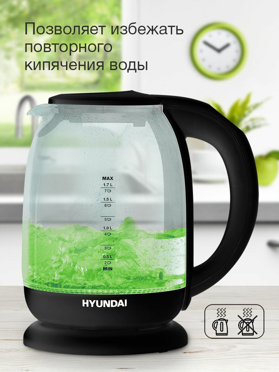 Чайник электрический Hyundai HYK-S3809 черный, объём 1.7л, мощность 2200Вт, материал корпуса: стекло интересное: