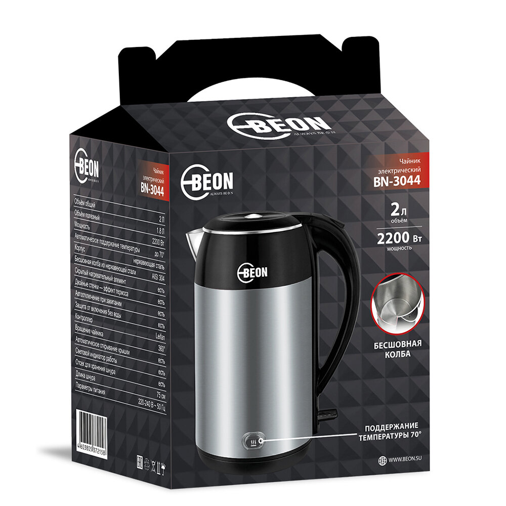 Купить Чайник электрический Beon BN-3044, 2200 Вт, 2 литра, стальной/черный