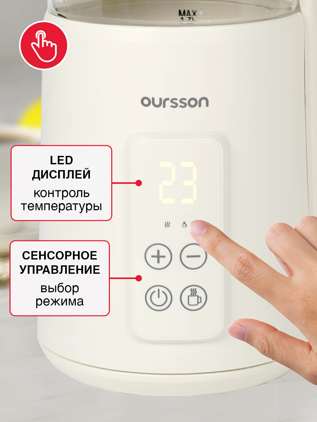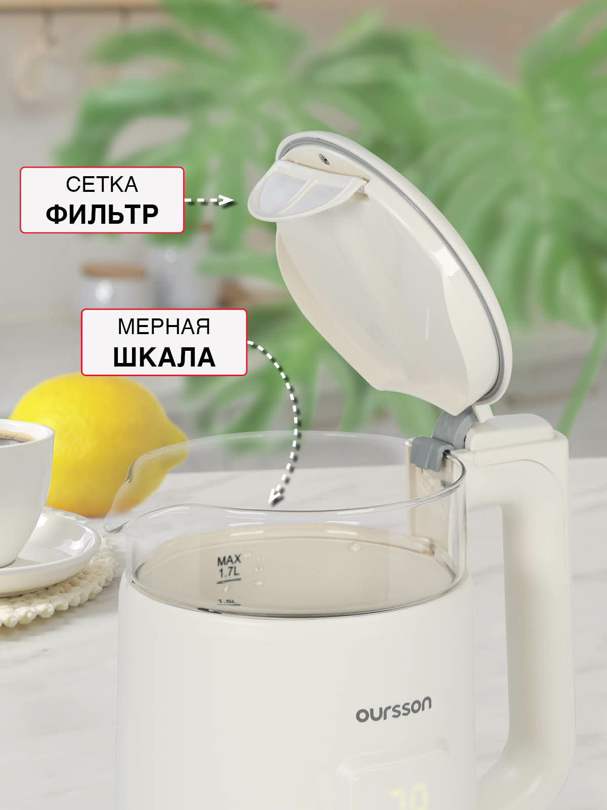 Чайник Oursson KE1745GD, 1.7л, мощность 2200Вт, с подсветкой, вращение на 360°, двойные стенки интересное: