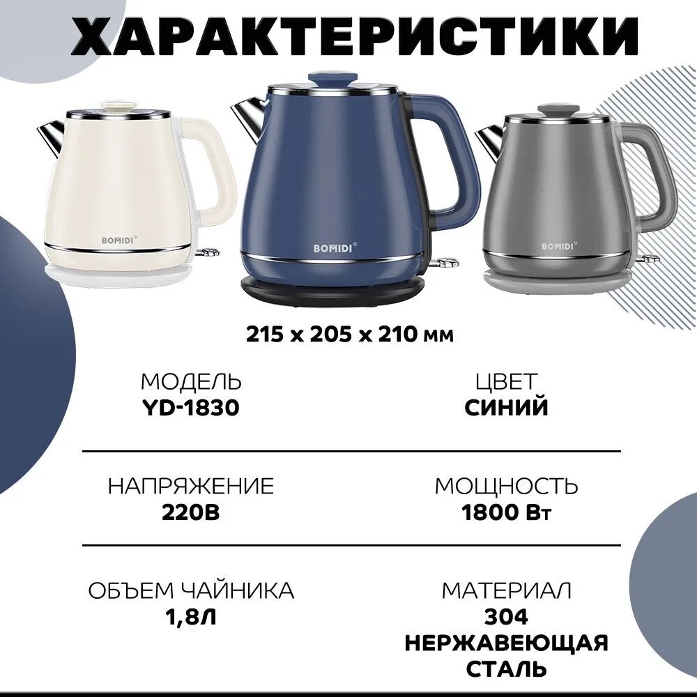 Электрический чайник BOMIDI BMD1830, 1,7 л, 1500 Вт, синий,вкладыш из нержавеющей стали 304