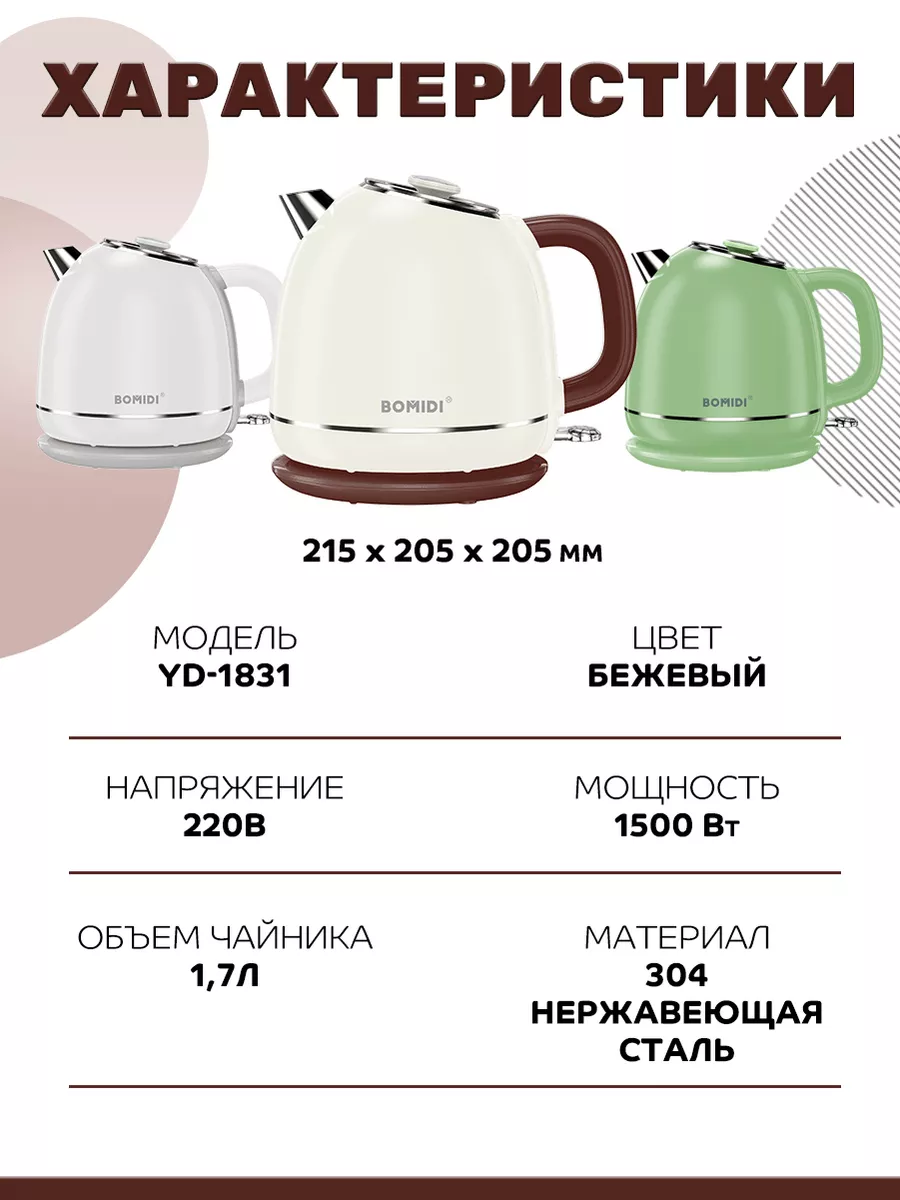 Электрический чайник BOMIDI BMD1830, 1,7 л, 1500 Вт, Бежевый,вкладыш из нержавеющей стали 304