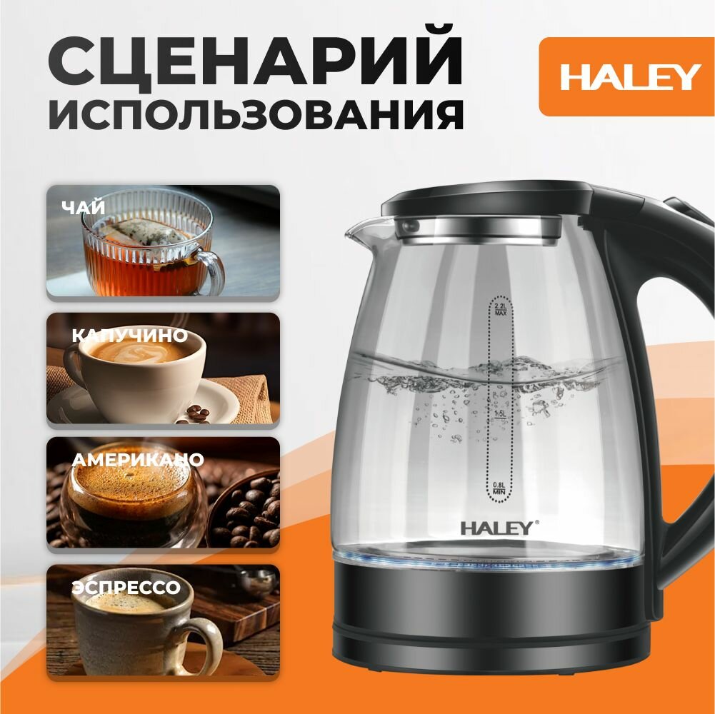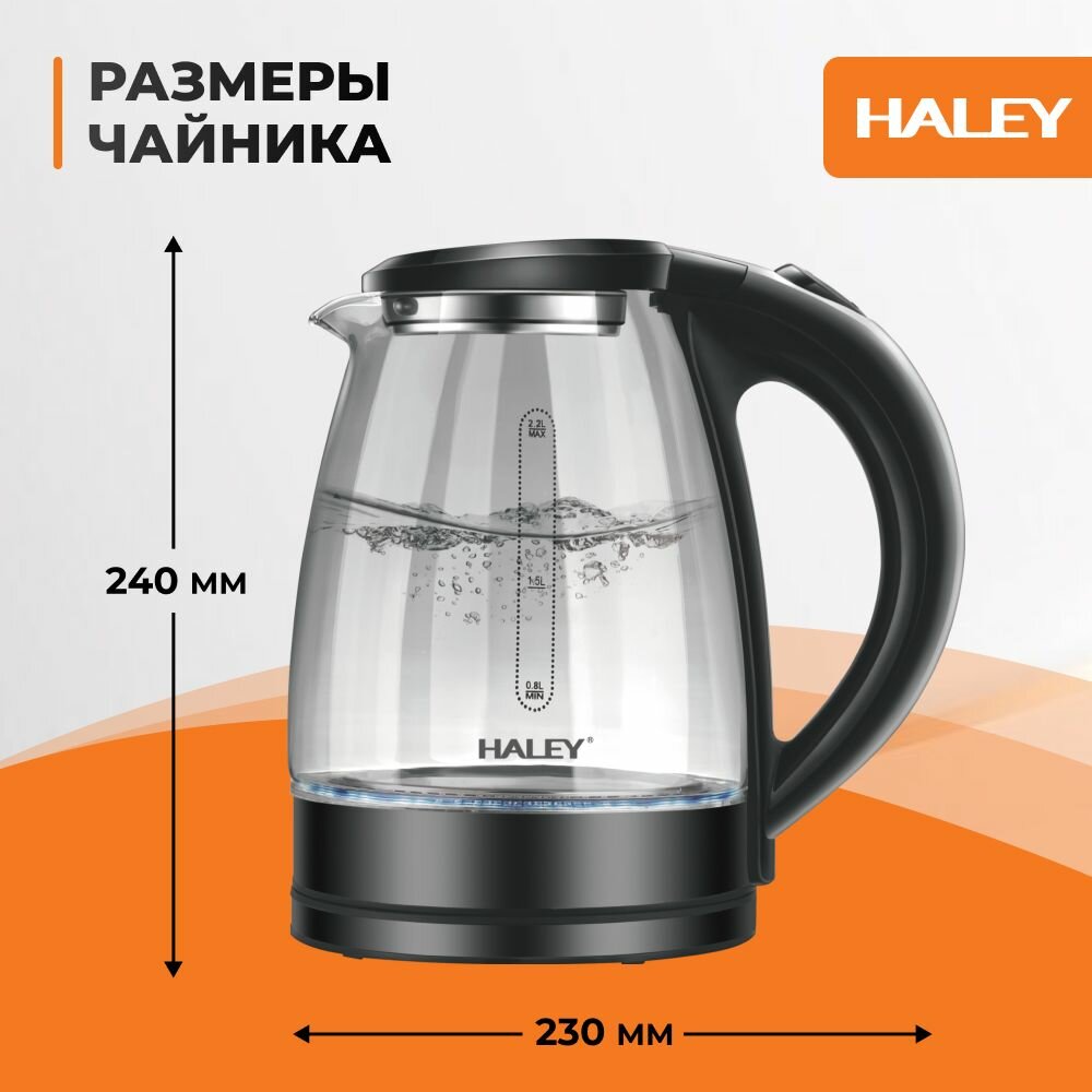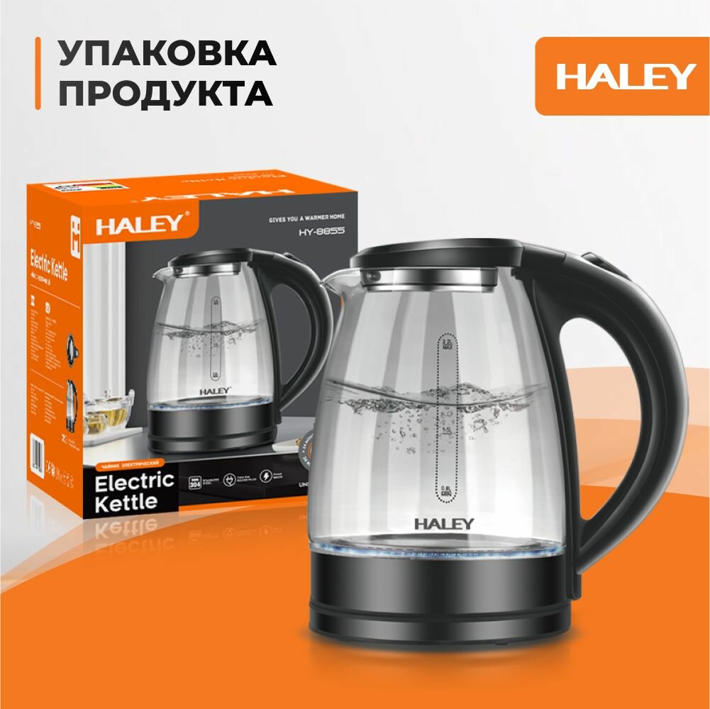 Электрический чайник HALEY-8855, стеклянный, черный, объем 1.8 литра, мощность 1800 Вт, быстрый кипяток, защита от перегрева.