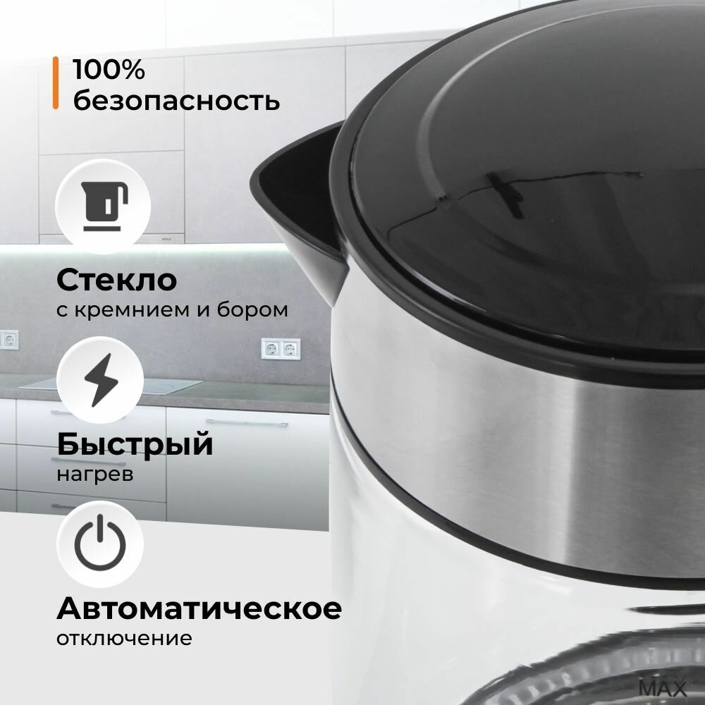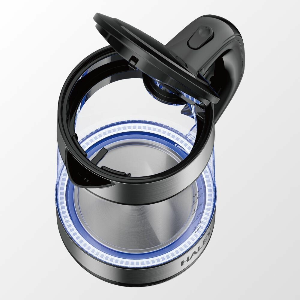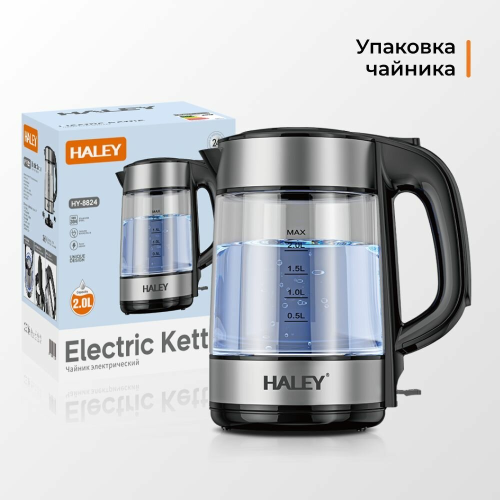 Купить Чайник электрический стеклянный HALEY-8824 с подсветкой из высокопрочного стекла объем 2.0 литра, мощность 2200 Втчерный/серебристый