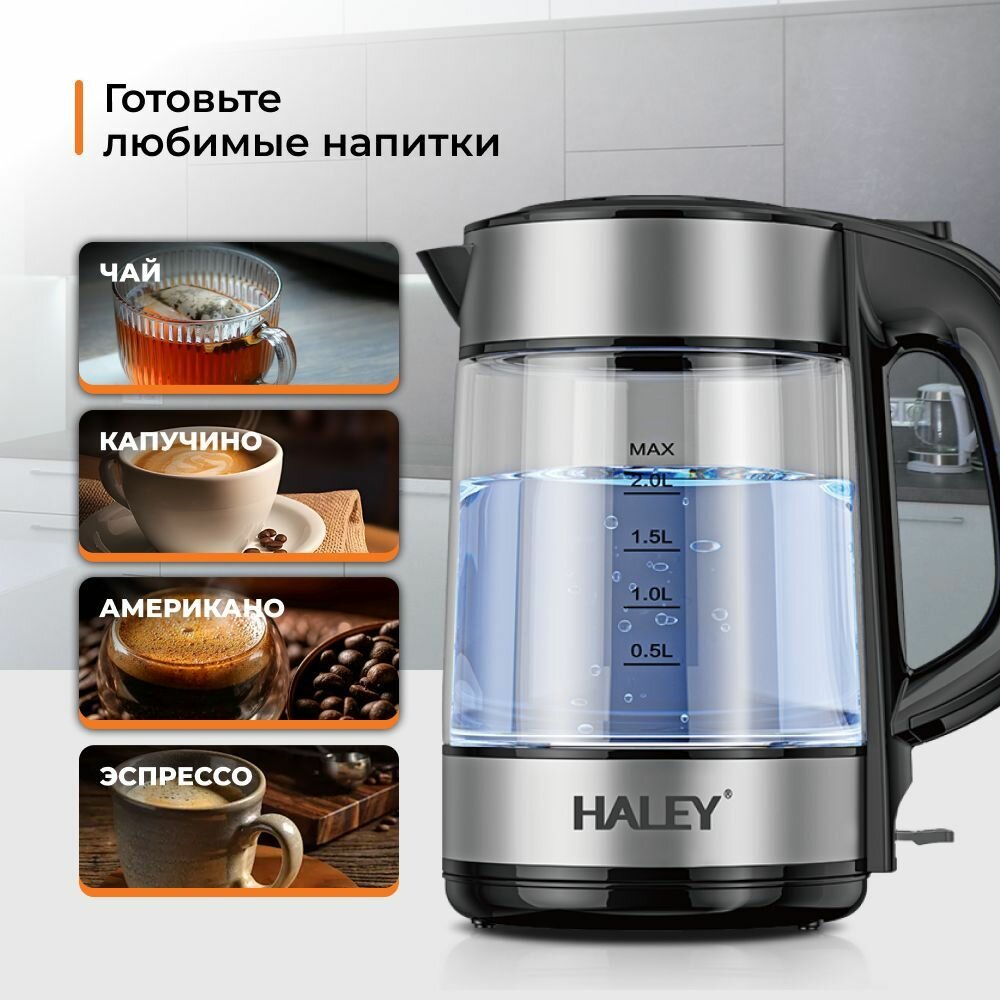 Электрический чайник HALEY-8855, стеклянный, черный, объем 1.8 литра, мощность 1800 Вт, быстрый кипяток, защита от перегрева.