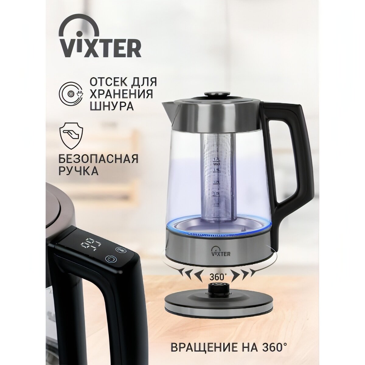Чайник электрический VIXTER KTP-1525 двойная колба 2150 Вт черный 6 температурных режимов: 40/50/60/70/80/90°С