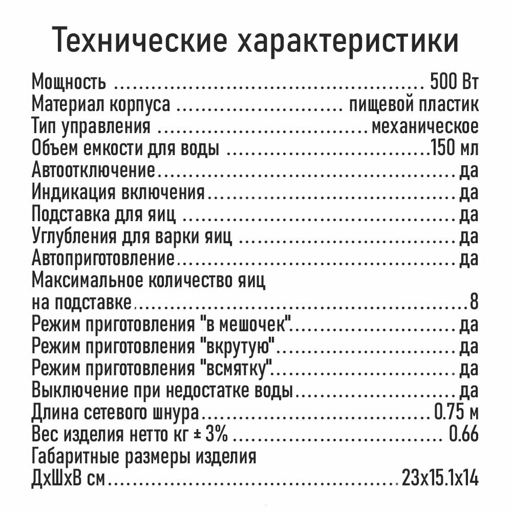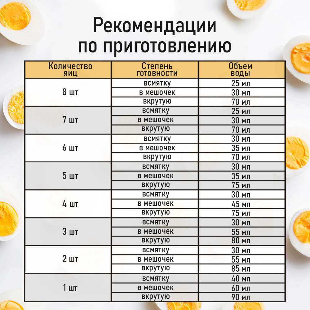 | Дополнительные функции | в мешочек, вкрутую, всмятку, индикация включения, отключение при недостатке воды, пищевой пластик |