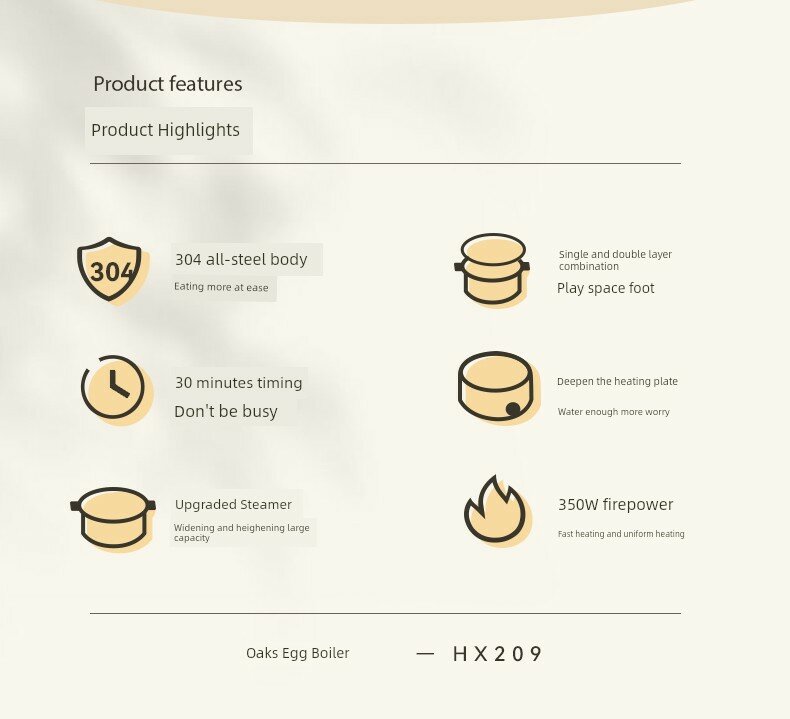 | Дополнительная информация | таймер на 30 минут, автоматическое отключение, быстрое нагревание, равномерный нагрев, комбинация одинарного/двойного слоя, большая вместимость, корпус из нержавеющей стали 304, конструкция ручки для легкой эксплуатации, можно выбрать нагрев для приготовления на пару и жарки, мощность 350 Вт, защита от выкипания, номинальная мощность: 350 Вт, вместимость воды: 300 мл, номинальная вместимость: один слой 7 яиц, два слоя 14 яиц |