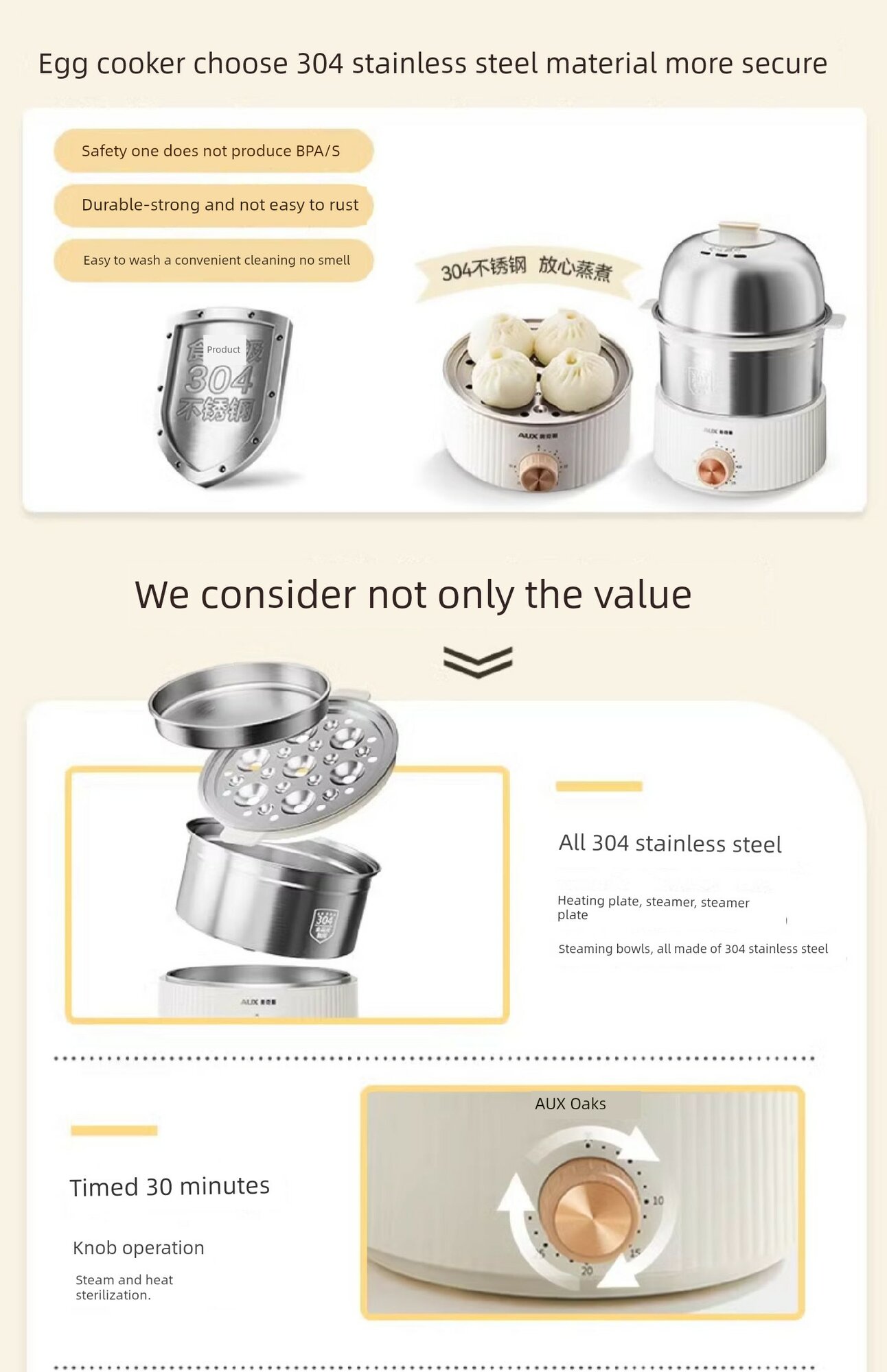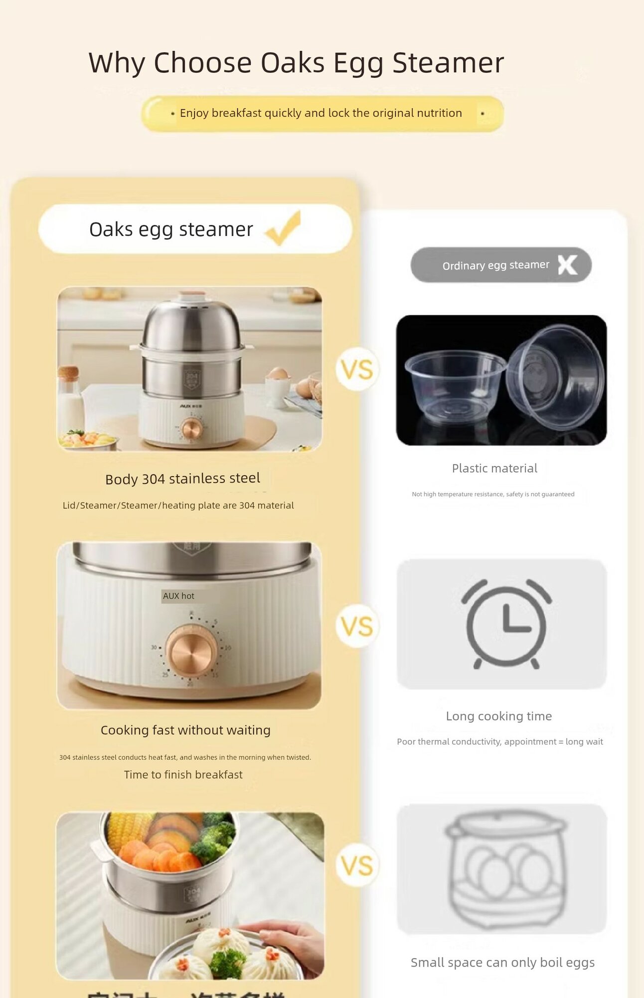 | Дополнительная информация | пароварка из нержавеющей стали 304, крышка из нержавеющей стали 304, решетка для приготовления на пару из нержавеющей стали 304, миска для приготовления на пару из нержавеющей стали 304, нагревательная пластина из нержавеющей стали 304, средство для удаления накипи, сепаратор яичного белка, ткань для очистки, функция таймера, двухслойная конструкция |