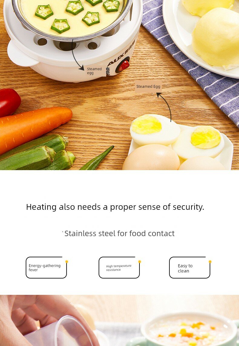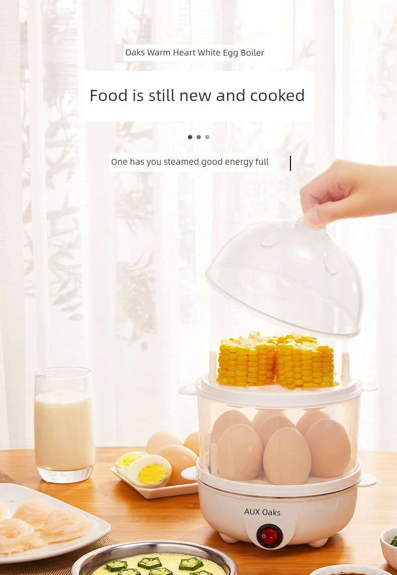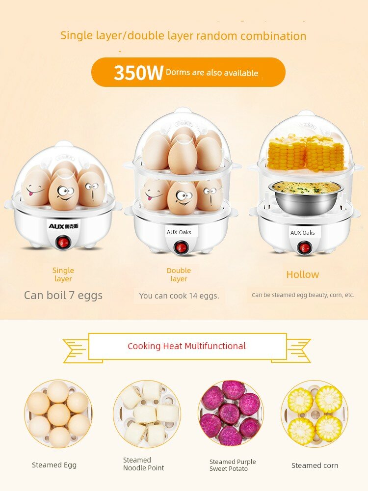 | Дополнительная информация | один слой, можно варить 7 яиц, гарантия 1 год, включает мерный стакан, нержавеющая сталь для контакта с пищевыми продуктами, можно готовить яичную массу, кукурузу и т. д., подогрев, многофункциональный, приготовление яиц на пару, приготовление фиолетового сладкого картофеля на пару, приготовление кукурузы на пару, малая мощность 350 вт, защита от сухого горения, автоматическое отключение питания, также доступны общежития, приготовление цельного яйца в три простых шага, материалы для контакта с пищевыми продуктами, безопасно, устойчиво к высоким температурам и долговечно, более надежно, треугольная вилка безопасности, прочное и долговечное вставление и извлечение, более надежный провод заземления, приостановка работы нагрева, объемный пар 360, трехмерный цикл нагрева быстро проникает в пищу, интеллектуальное управление зрелостью яичного желтка |
