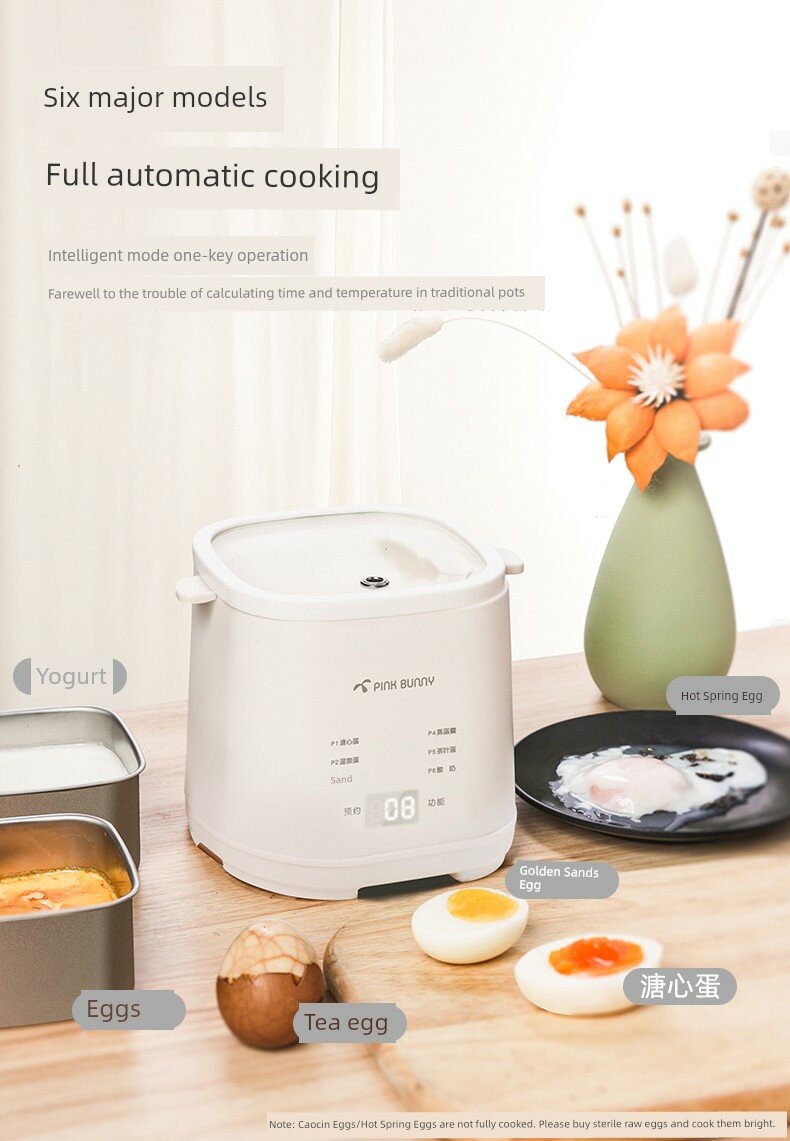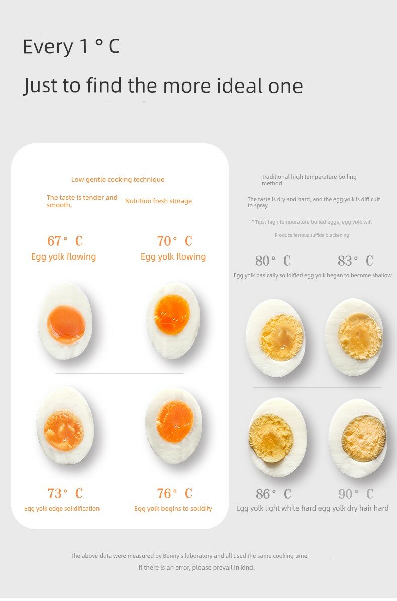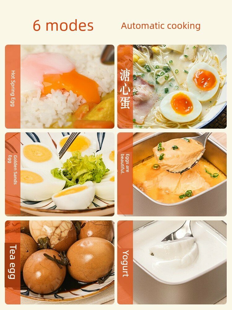 | Дополнительная информация | сердечные яйца, яйца горячего источника, яйца «золотой песок», яйца на пару, чайные яйца, йогурт, 6 режимов меню, автоматическое приготовление, интеллектуальное резервирование, визуальный обратный отсчет, пищевой материал, одно касание, безопасность и высокая термостойкость, простота в эксплуатации, точный контроль температуры, температурный зонд ntc, равномерная теплопередача, защита от сухого горения, автоматическое отключение при нехватке воды, 4 подставки для яиц, чаша 380 мл, номинальная мощность 300 вт |