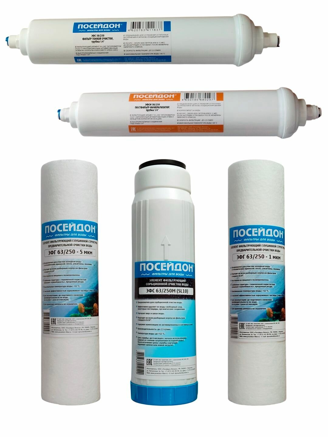 Купить Комплект картриджей 5 ступеней для блока предочистки SL10 №202 + минерализатор + фильтр тонкой очистки Посейдон