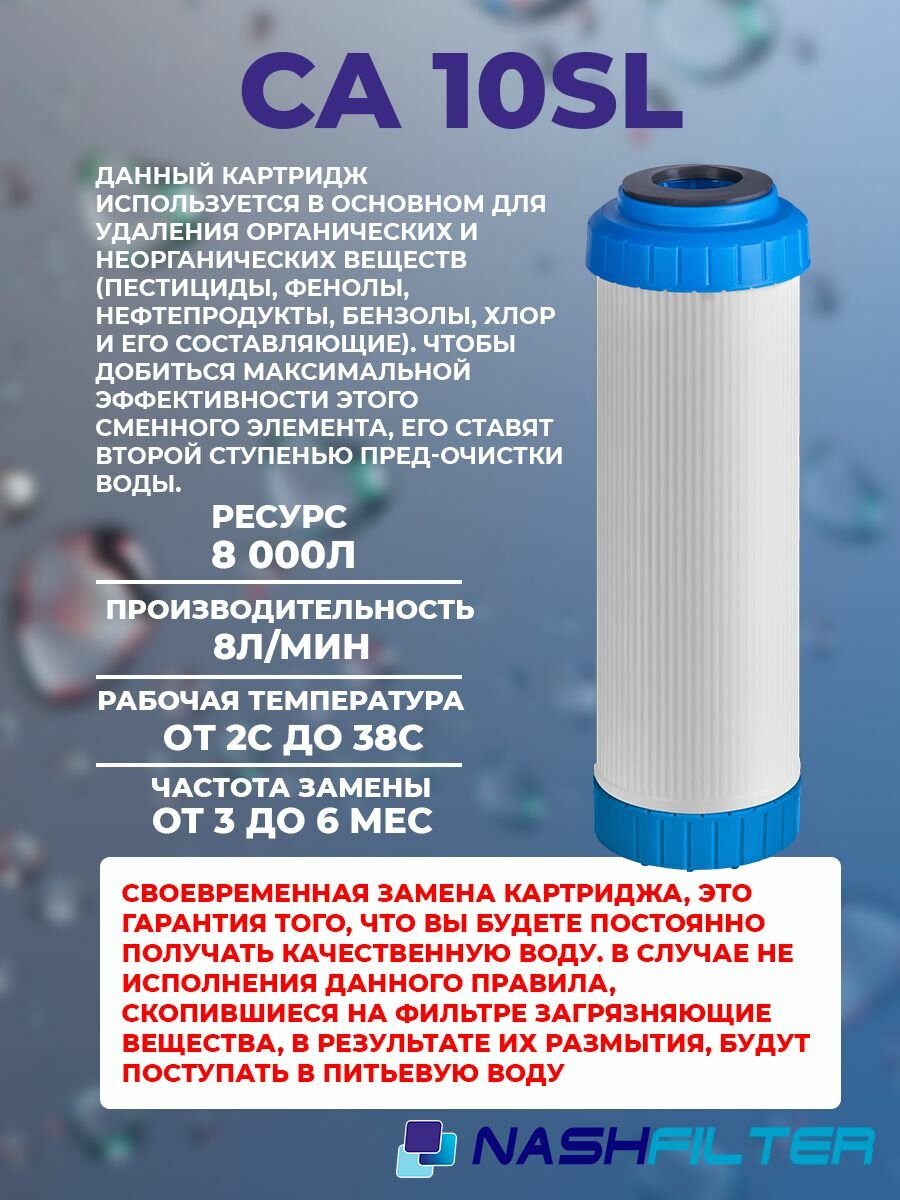 | Комплектация | Картридж для фильтра воды с гранулированным углём CA 10SL 3шт |