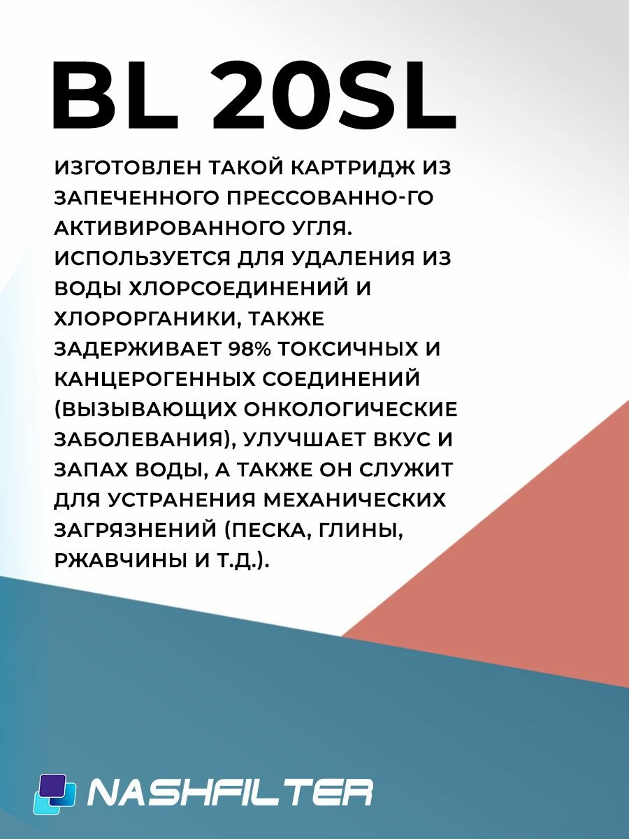 Картридж для фильтра угольный NASHFILTER BL 20SL из прессованного угля, для сорбционной очистки воды (от хлора и органических соединений) 3 шт интересное: