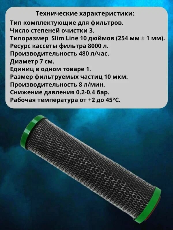 Картридж 3 в 1 CA 10 SL, механическая и сорбционная очистка воды (удаление хлора, механических загрязнений, остатки нефтепродуктов и др.), Slim Line 10