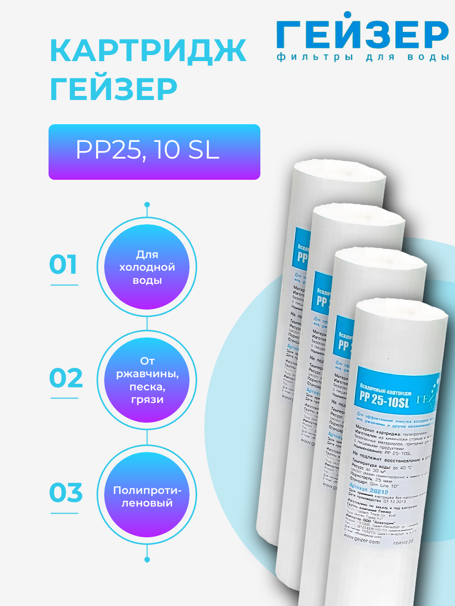 Ниже Вы можете прочитать отзывы на Картридж Гейзер PP 25, 28212, для магистрального фильтра, 10 SL, 15л/мин, 4 шт, ознакомится с подробными характеристиками, посмотреть интересные обзоры и фотографии на Картридж Гейзер PP 25, 28212, для магистрального фильтра, 10 SL, 15л/мин, 4 шт.