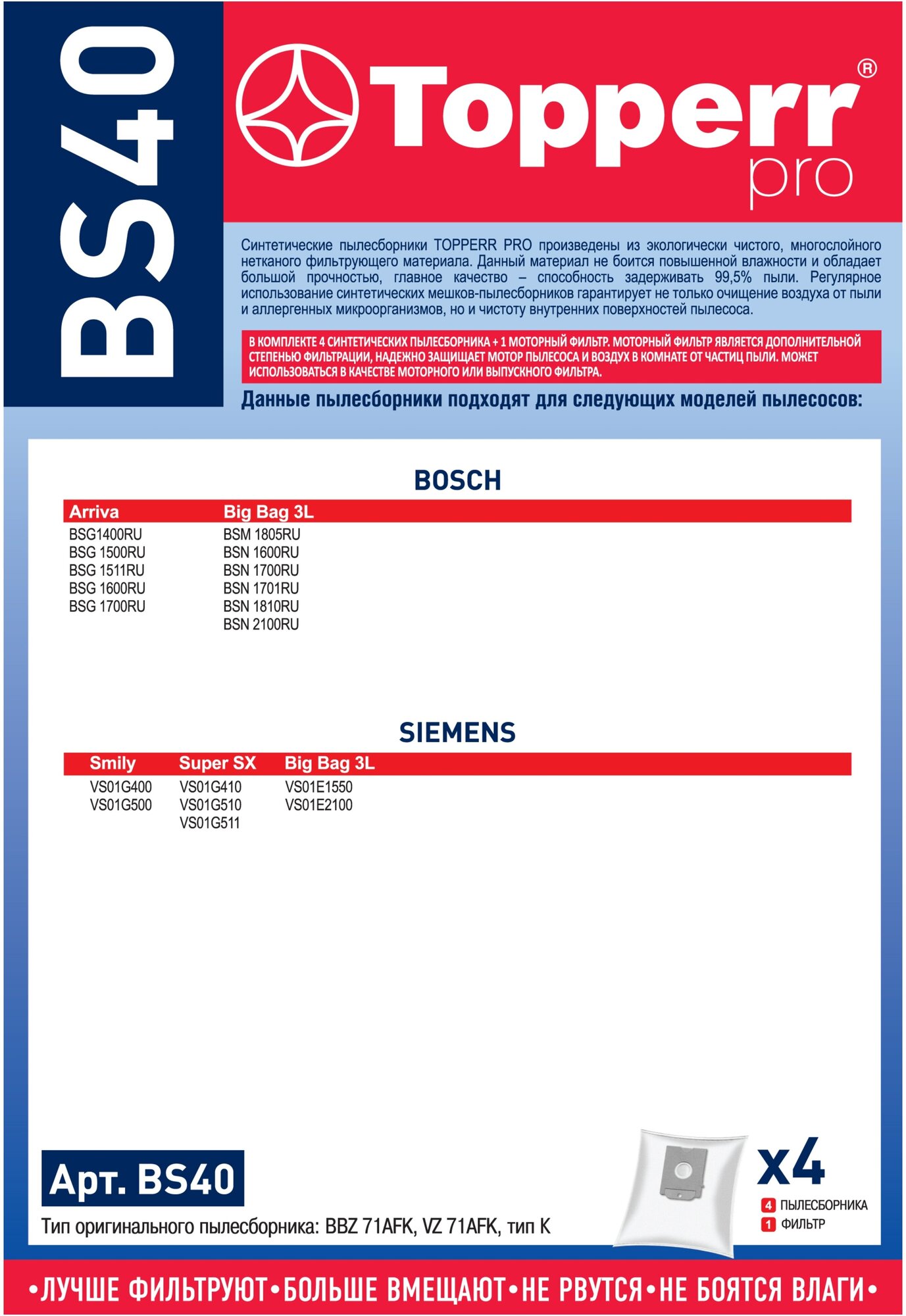Купить Topperr Пылесборник (мешок) синтетический для пылесоса Bosch, Siemens - 4 шт + 1 фильтр, BS40, BBZ71AFK, VZ71AFK