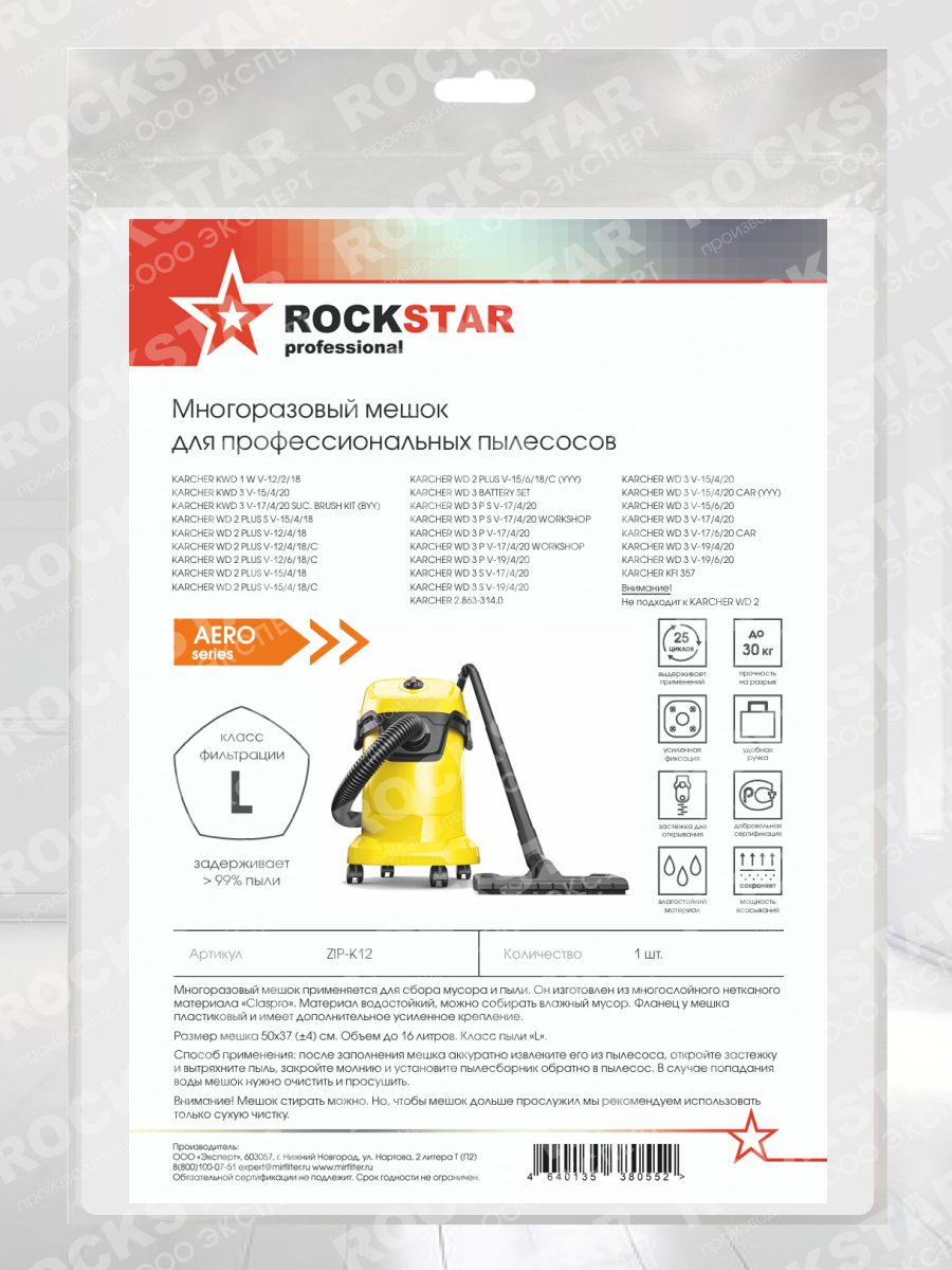 Мешок для пылесоса Керхер WD 2 Plus, Karcher WD 3, KWD 1, фильтр пакет многоразовый, ROCKSTAR ZIP-K12 интересное: