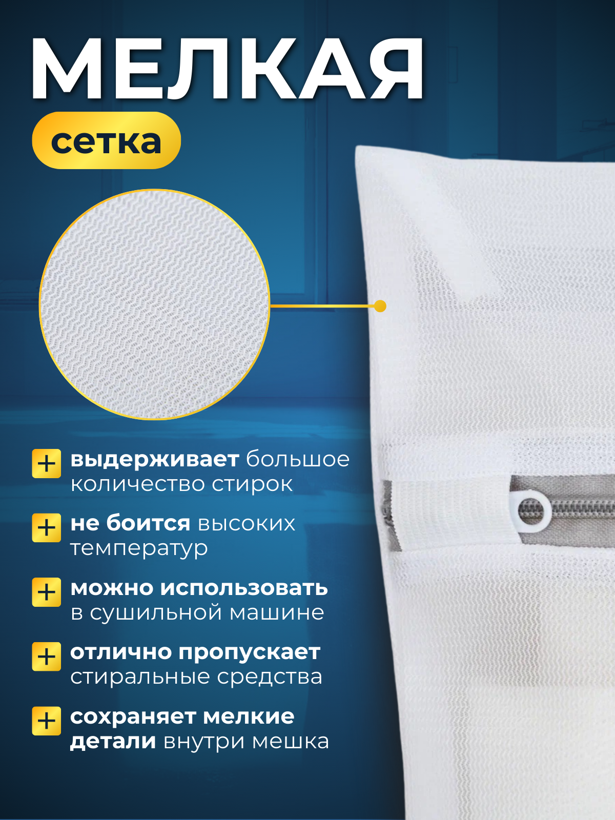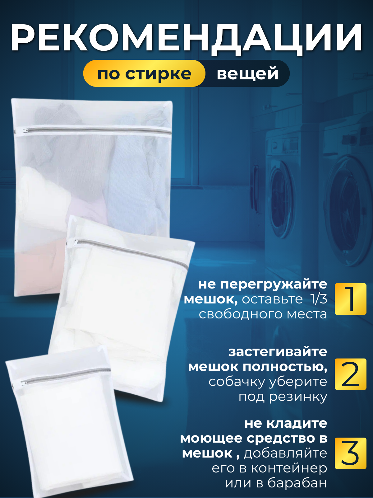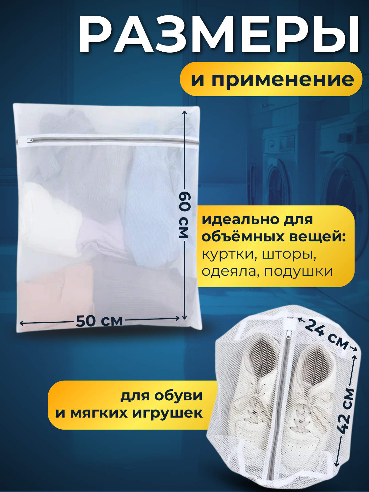 | Дополнительная информация | В комплекте 5 мешков для стирки на молнии разных размеров: Мешок для стирки большой: 50х 60 см. Мешок для стирки средний: 40х50 см. Мешок для стирки маленький: 30х40 см. Мешок для стирки нижнего белья: 17х18 см. Мешок для стирки кроссовок: 42х24х24 см. |