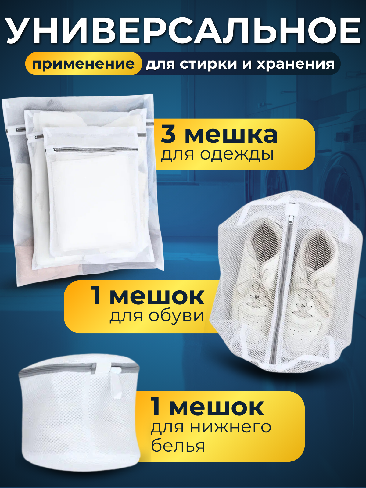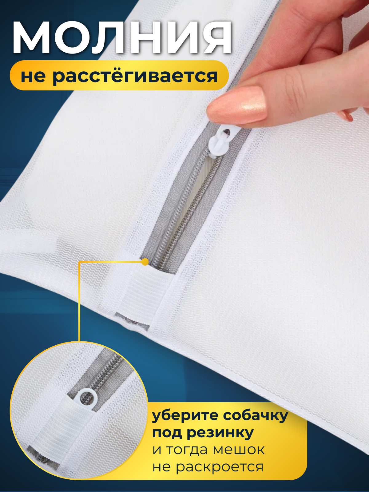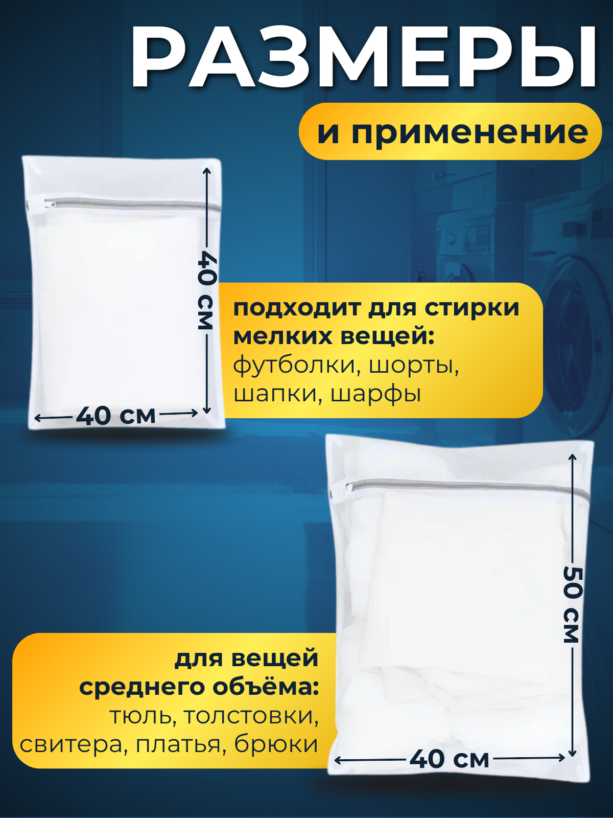 | Дополнительная информация | В комплекте 5 мешков для стирки на молнии разных размеров: Мешок для стирки большой: 50х 60 см. Мешок для стирки средний: 40х50 см. Мешок для стирки маленький: 30х40 см. Мешок для стирки нижнего белья: 17х18 см. Мешок для стирки кроссовок: 42х24х24 см. |