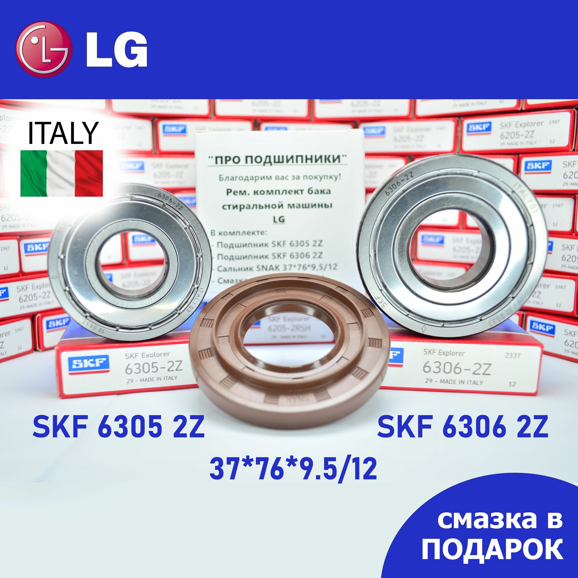 Ремкомплект бака для стиральной машины LG / SKF 6305 2Z, 6306 2Z, сальник 37*76*9.5/12 + смазка интересное: