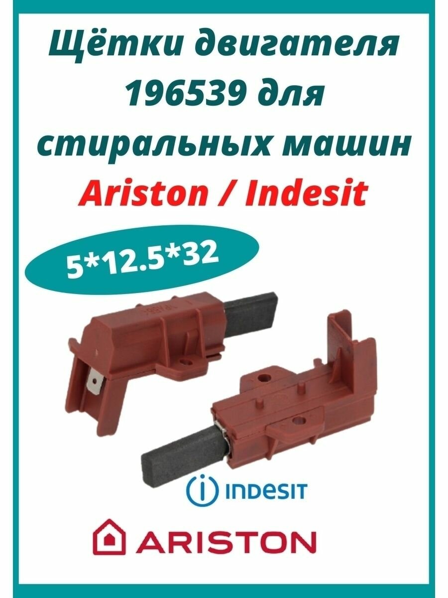 | Комплектация | Комплект щеток двигателя (2шт.) 196539 для стиральных машин Ariston, Indesit, Whirlpool, в корпусе коричневого цвета. Размер графитовой щетки 5x12.5x32 мм |