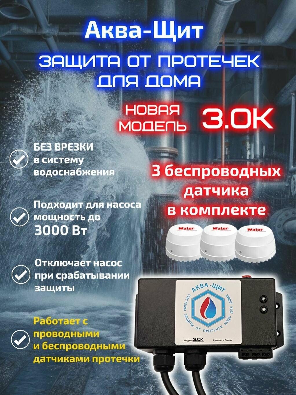 Купить Аква-Щит 3.0К (3Б) защита от протечек для дома (для насоса мощностью до 3кВт) 3 беспроводных датчика в комплекте