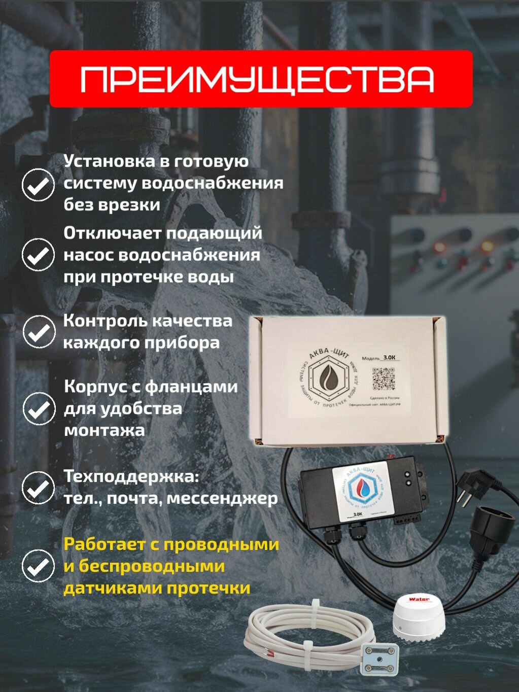 Ниже Вы можете прочитать отзывы на Аква-Щит 3.0К (2П) защита от протечек для дома (для насоса мощностью до 3кВт) 2 проводных датчика в комплекте, ознакомится с подробными характеристиками, посмотреть интересные обзоры и фотографии на Аква-Щит 3.0К (2П) защита от протечек для дома (для насоса мощностью до 3кВт) 2 проводных датчика в комплекте.