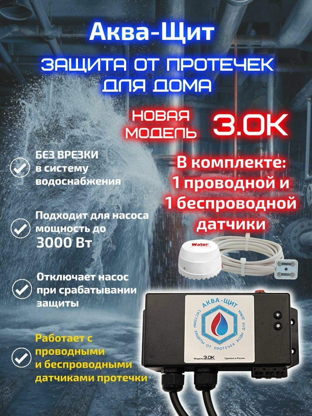СохранитьАква-Щит 3.0К (Комби) защита от протечек для дома (для насоса мощностью до 3кВт) 1 беспроводной + 1 проводной датчик в комплекте интересное: