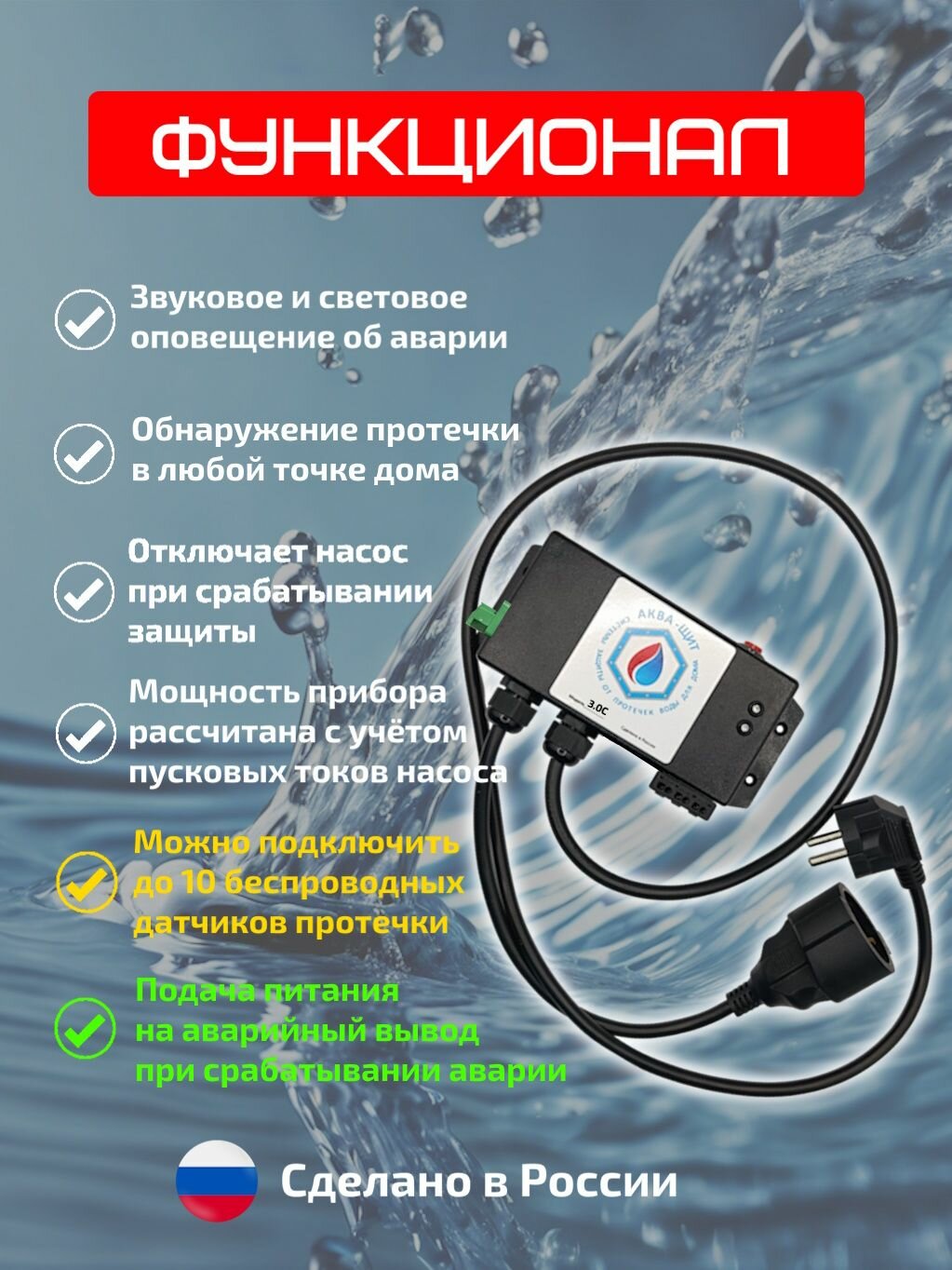Аква-Щит 3.0С (2П) защита от протечек для дома (для насоса до 3кВт) + аварийный вывод 220В, 2 проводных датчика в комплекте