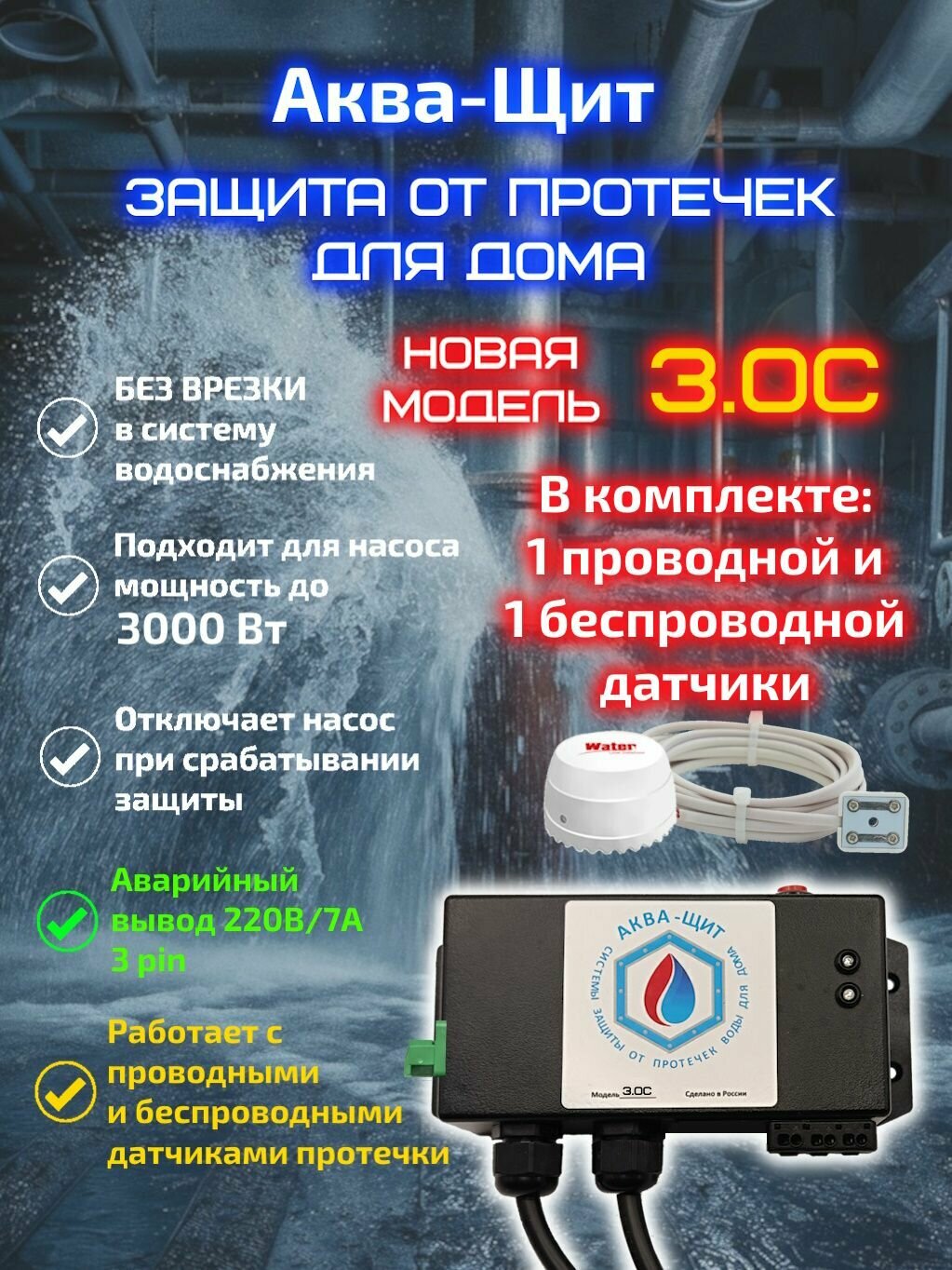 Аква-Щит 3.0С (3Б) защита от протечек для дома (для насоса до 3кВт) + аварийный вывод 220В, 3 беспроводных датчика в комплекте