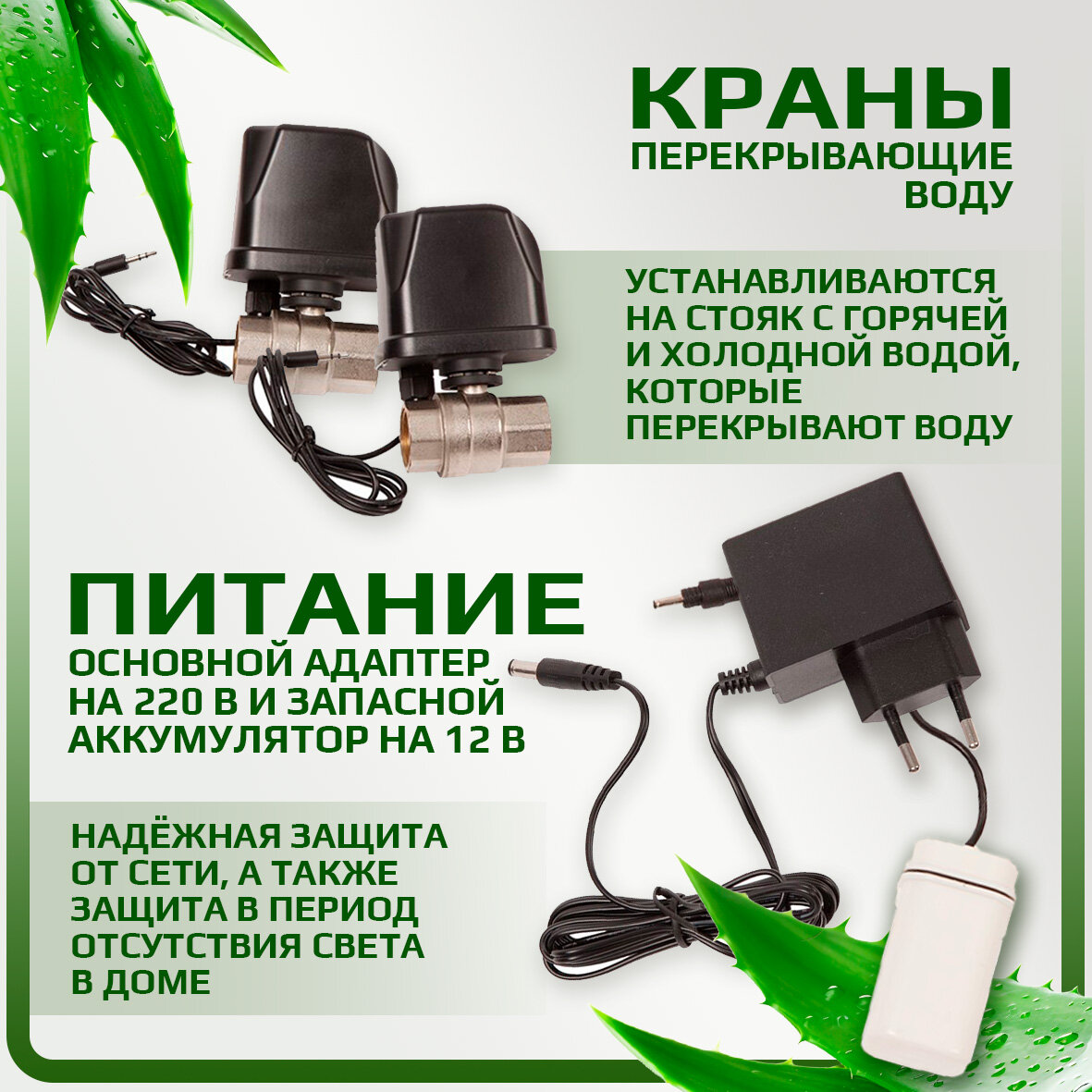 | Подробная комплектация | Контроллер - 1 шт. Запорный кран 1/2" с ЭП - 2 шт. Проводной датчик протечки - 2 шт. Адаптер питания - 1 шт. Кейс резервного питания - 1 шт. |