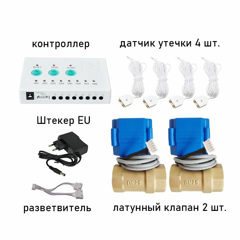 | Подробная комплектация | контроллер 1шт. латунный клапан 2 шт. разветвитель 1шт. датчик утечки 4 шт. Штекер EU 1шт. |
