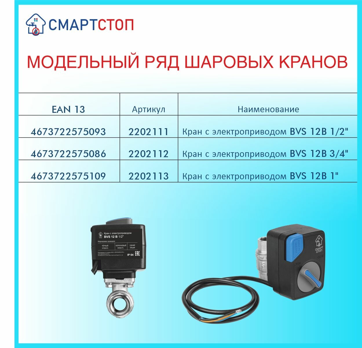 | Подробная комплектация | Блок управления СМАРТСТОП - 1шт; Кран с электроприводом BVS 12B 1/2 - 2шт; Датчик проводной СМАРТСТОП - 3шт; Сетевой адаптер 12V, 3A - 1шт; Паспорт - 1шт |