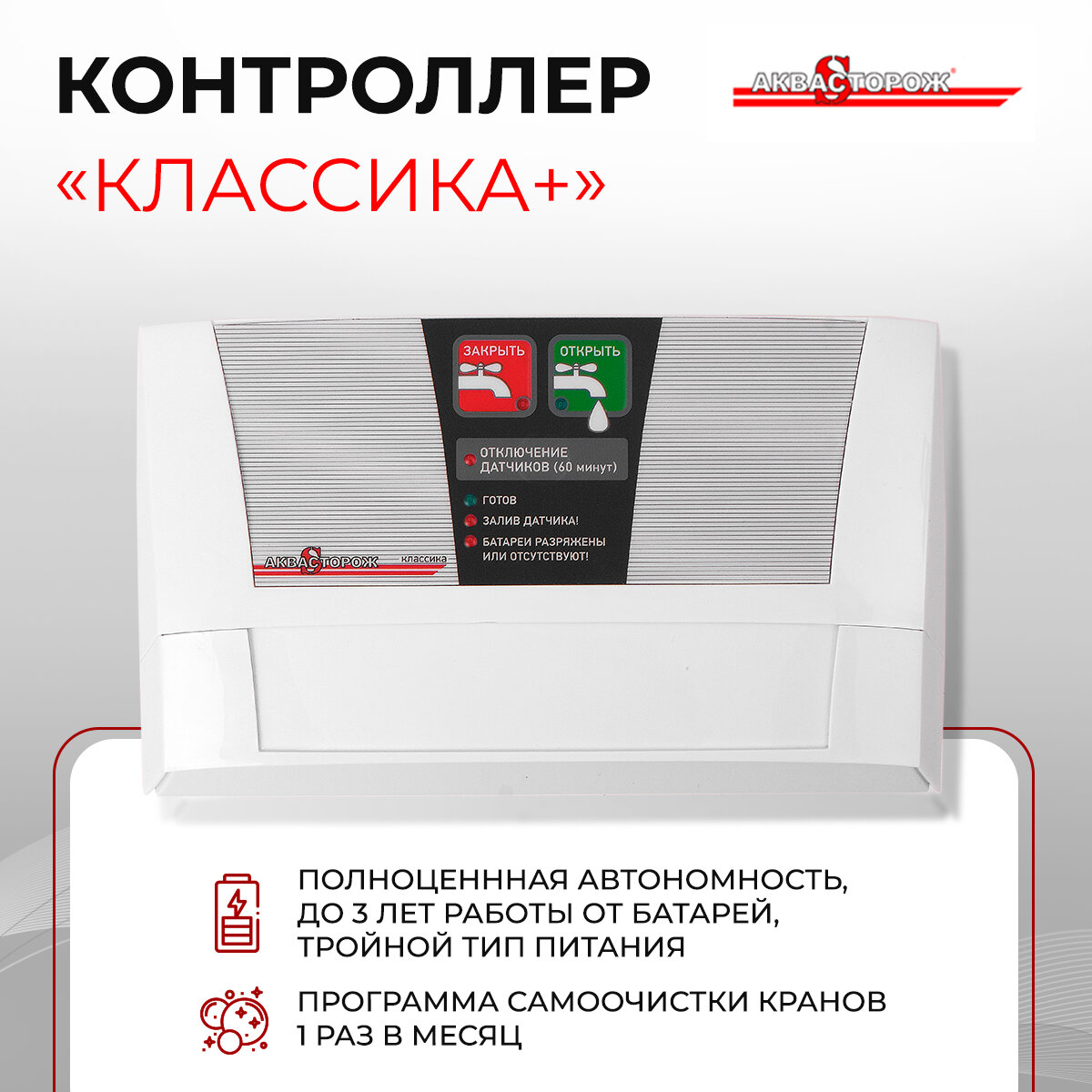 | Подробная комплектация | Контроллер Классика +, Кран 1/2"RuB с приводом "Аквасторож Оригинал" - 1 шт., Датчик проводной Классика - 1 шт., кабель проводного датчика - 2м, Батарея LR14 - 3 шт |