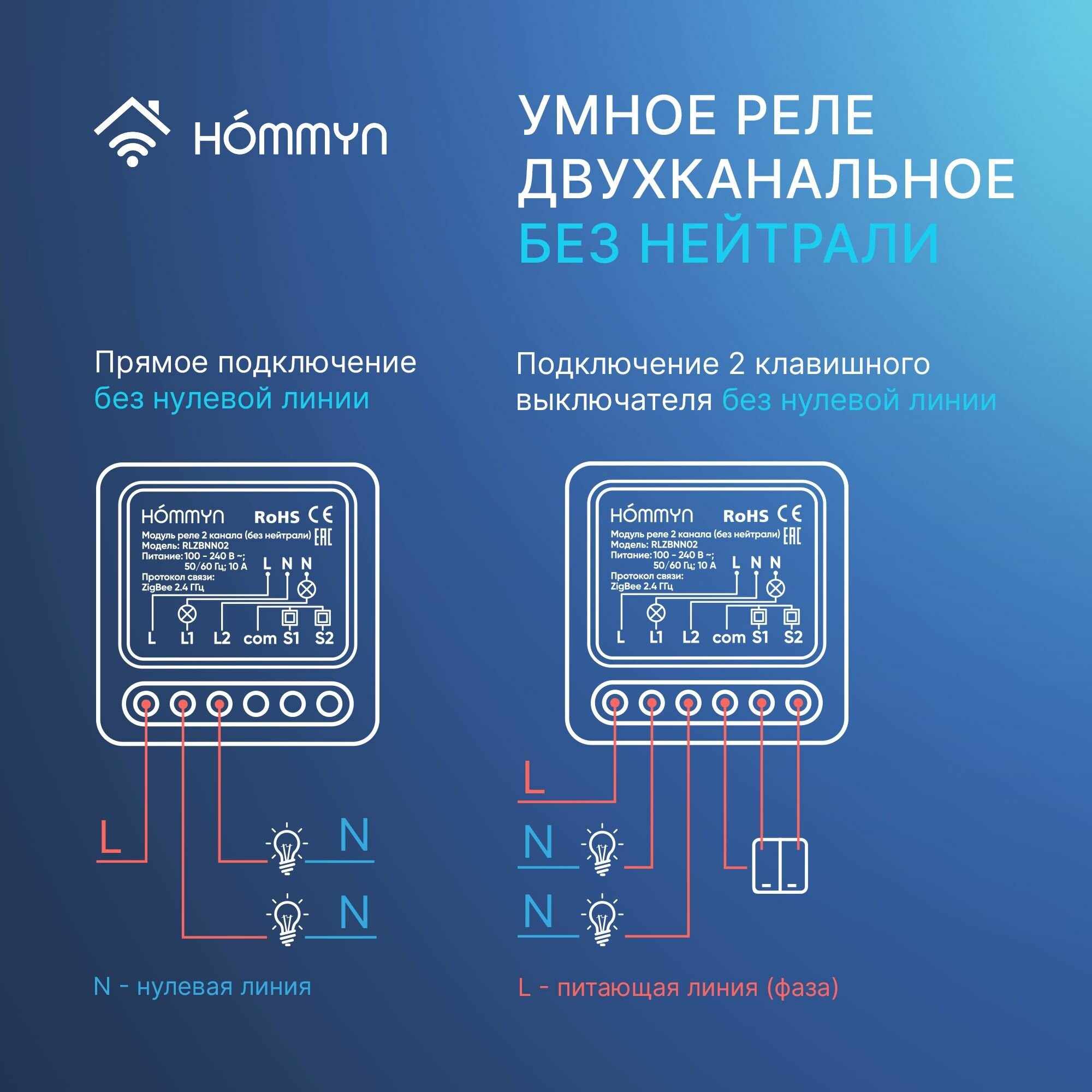 Купить Модуль реле HOMMYN zigbee 2 канала (без нейтрали) RLZBNN02
