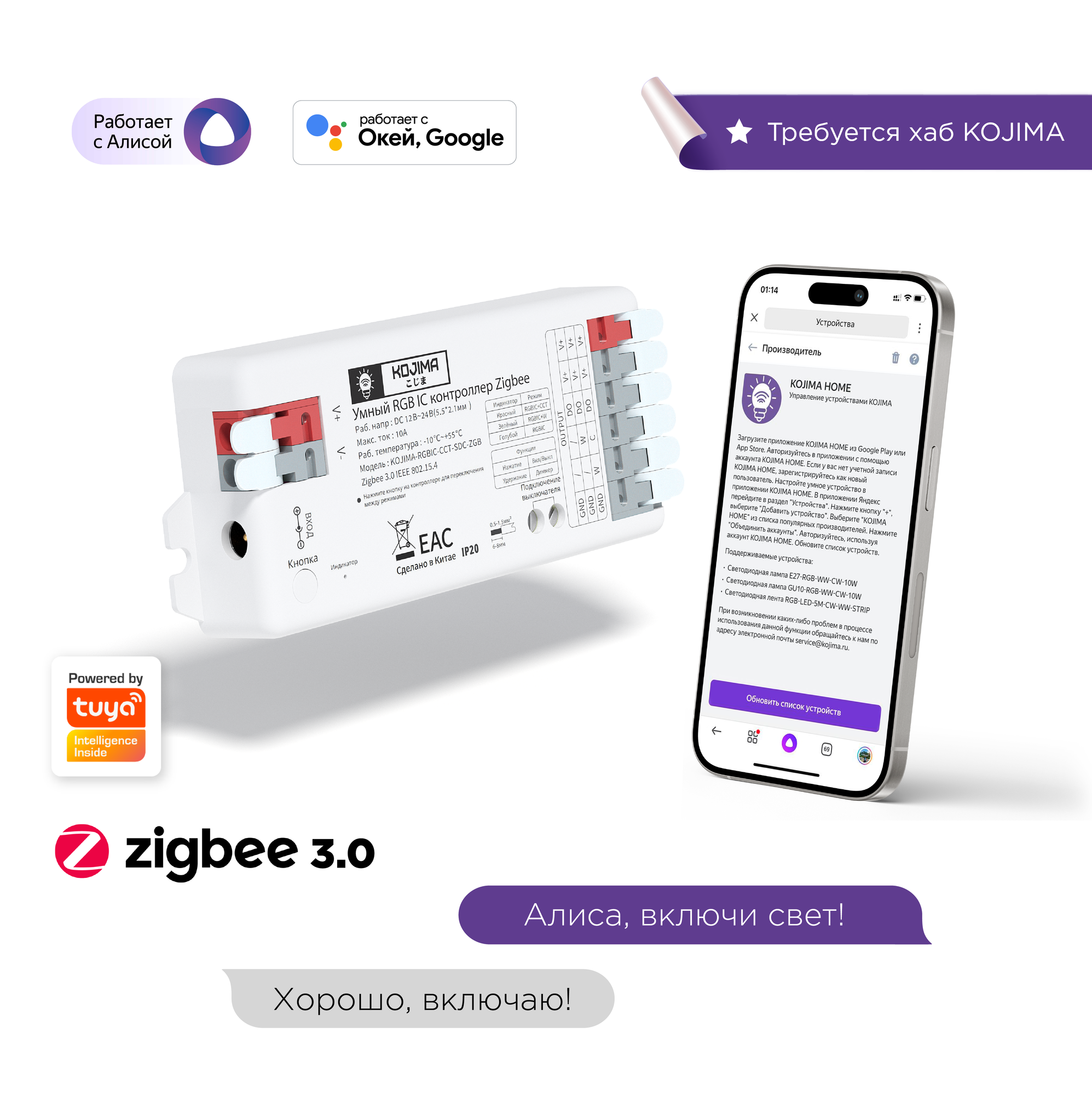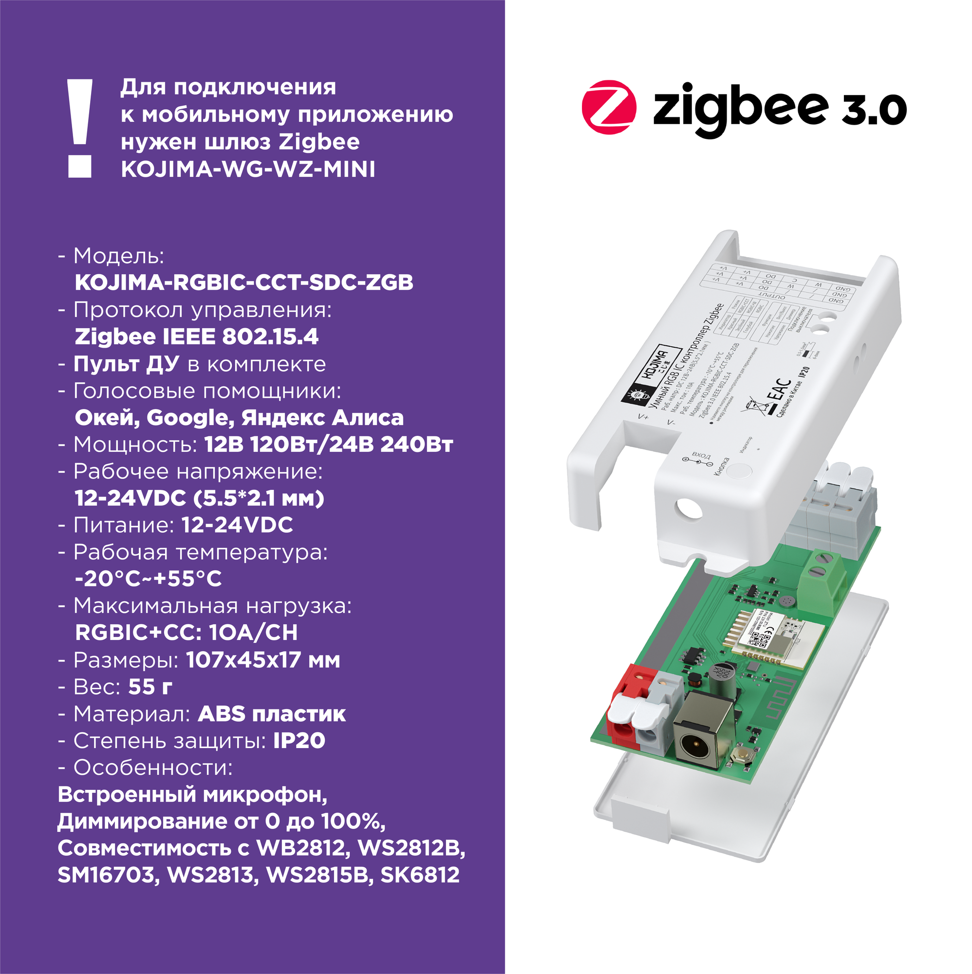 | Подробная комплектация | Умный контроллер, коннекторы соединения, пульт ДУ, инструкция |