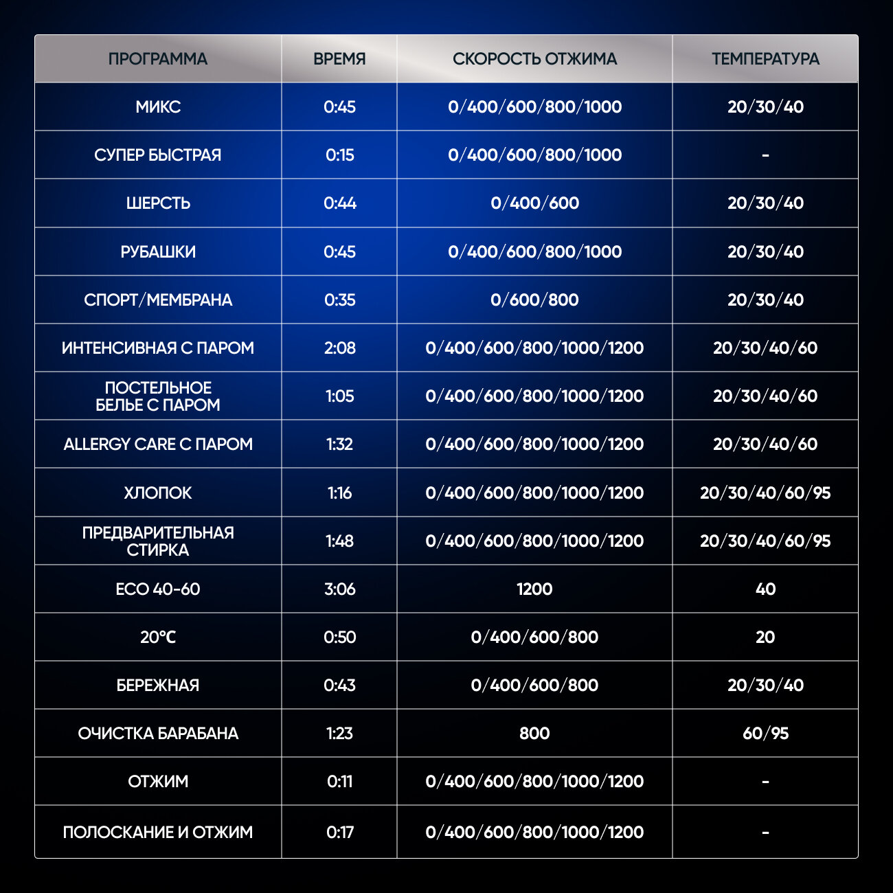 | Программы | быстрая стирка / гипоаллергенная стирка / интенсивная стирка / отжим / предварительная стирка / стирка спортивной одежды / стирка хлопка / стирка шерсти / 20 градусов / бережная стирка / микс / очистка барабана / полоскание и отжим / стирка постельного белья с паром / Стирка рубашек / эко 40-60 |