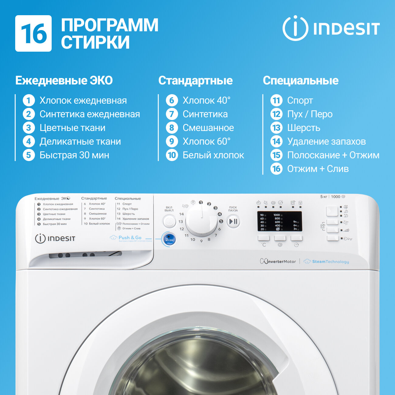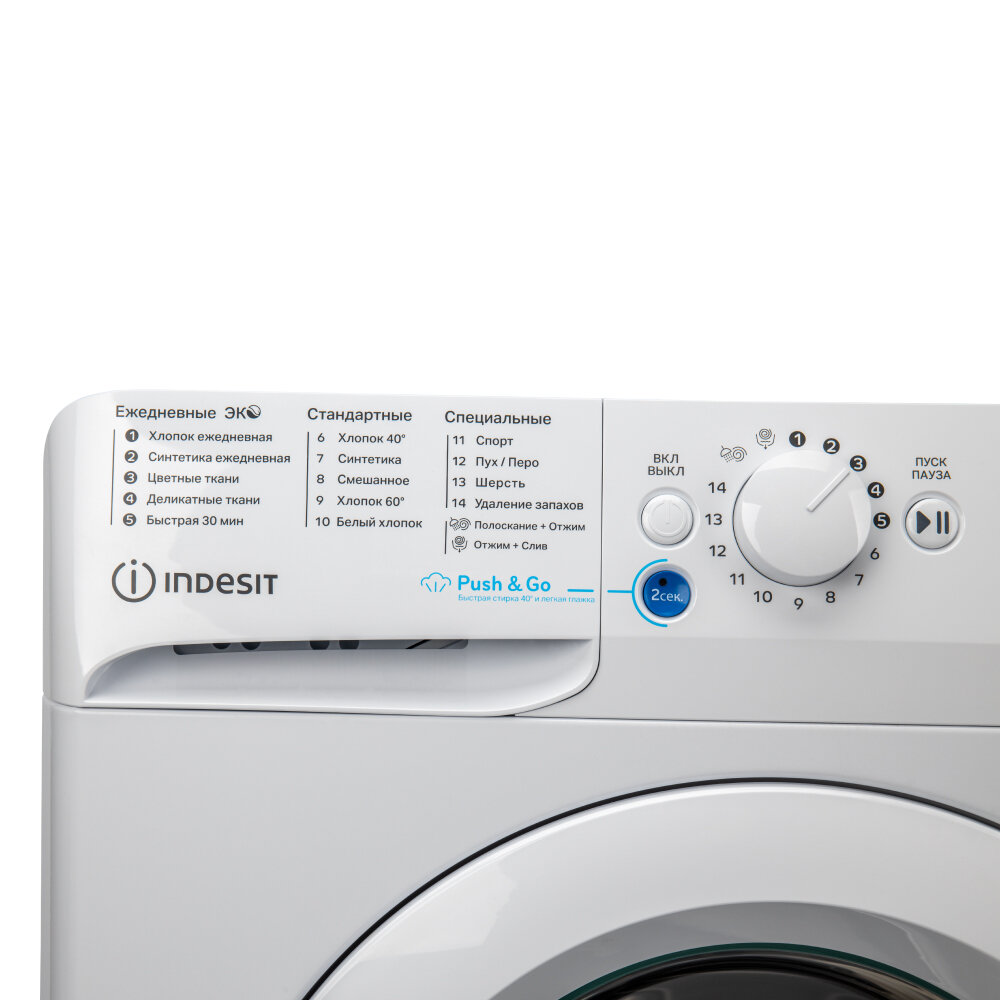 Стиральная машина INDESIT (5 кг), 1000 об/мин, LED+, инверторный мотор, Push & Wash, Датчик баланса воды, 16 программ интересное: