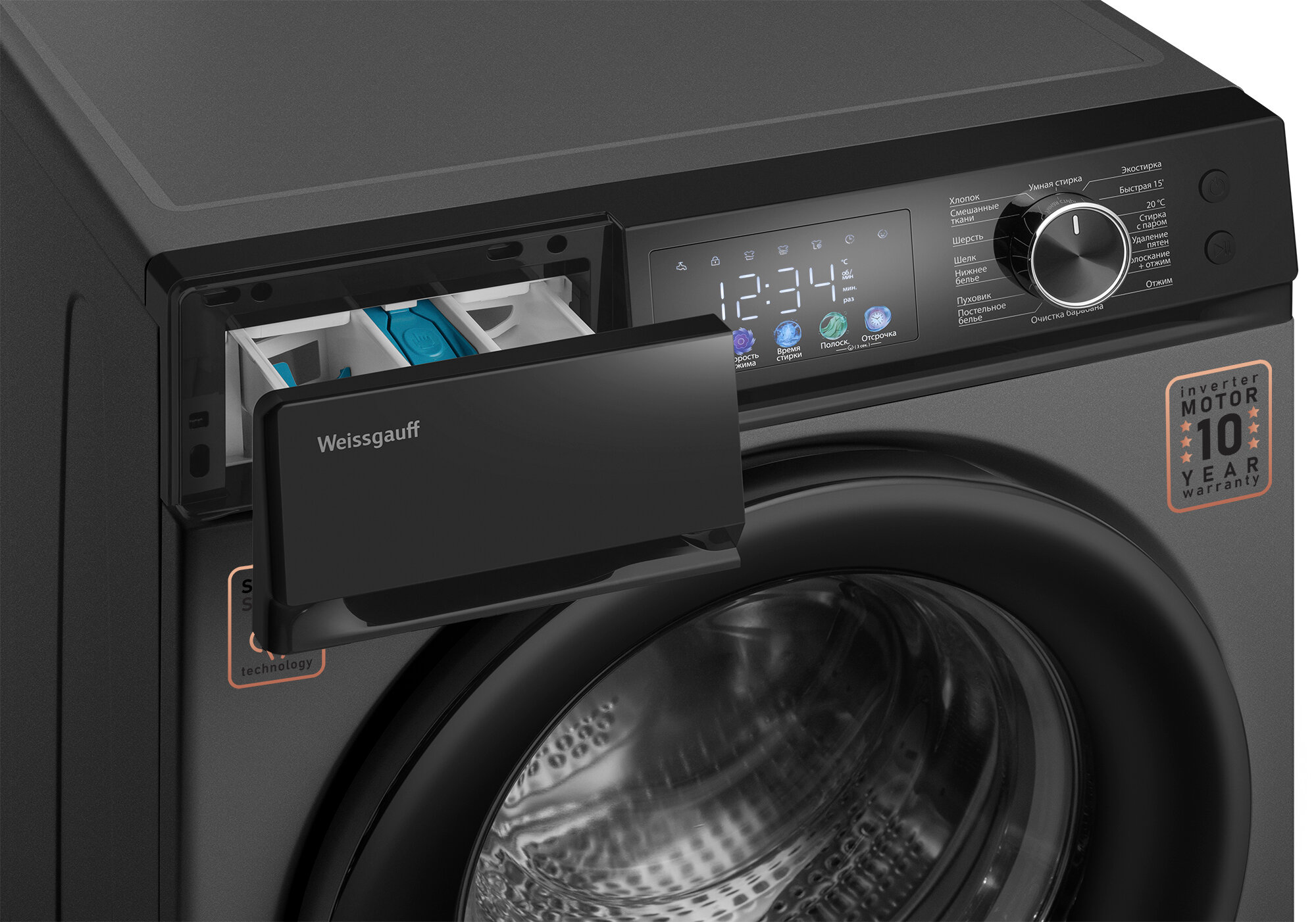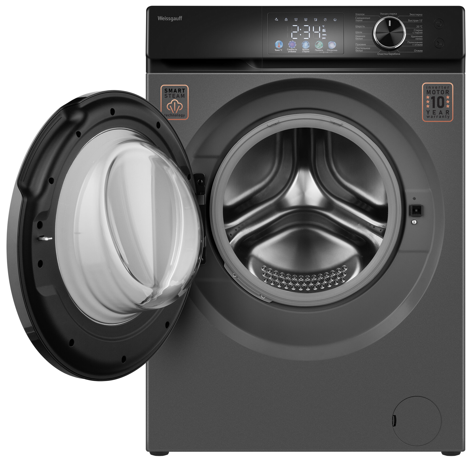 Cтиральная машина с инвертором и паром Weissgauff WM 45126 Inverter Steam Color Touch Grey интересное: