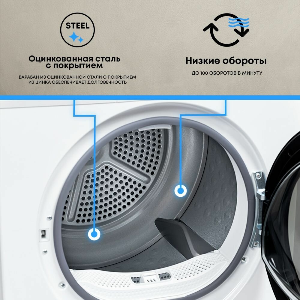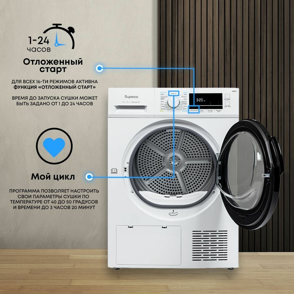Сушильная машина 8кг с тепловым насосом Heat Pump, с большим дисплеем, съемный фильтр, Бирюса DM-MG8/03, цвет Белый интересное: