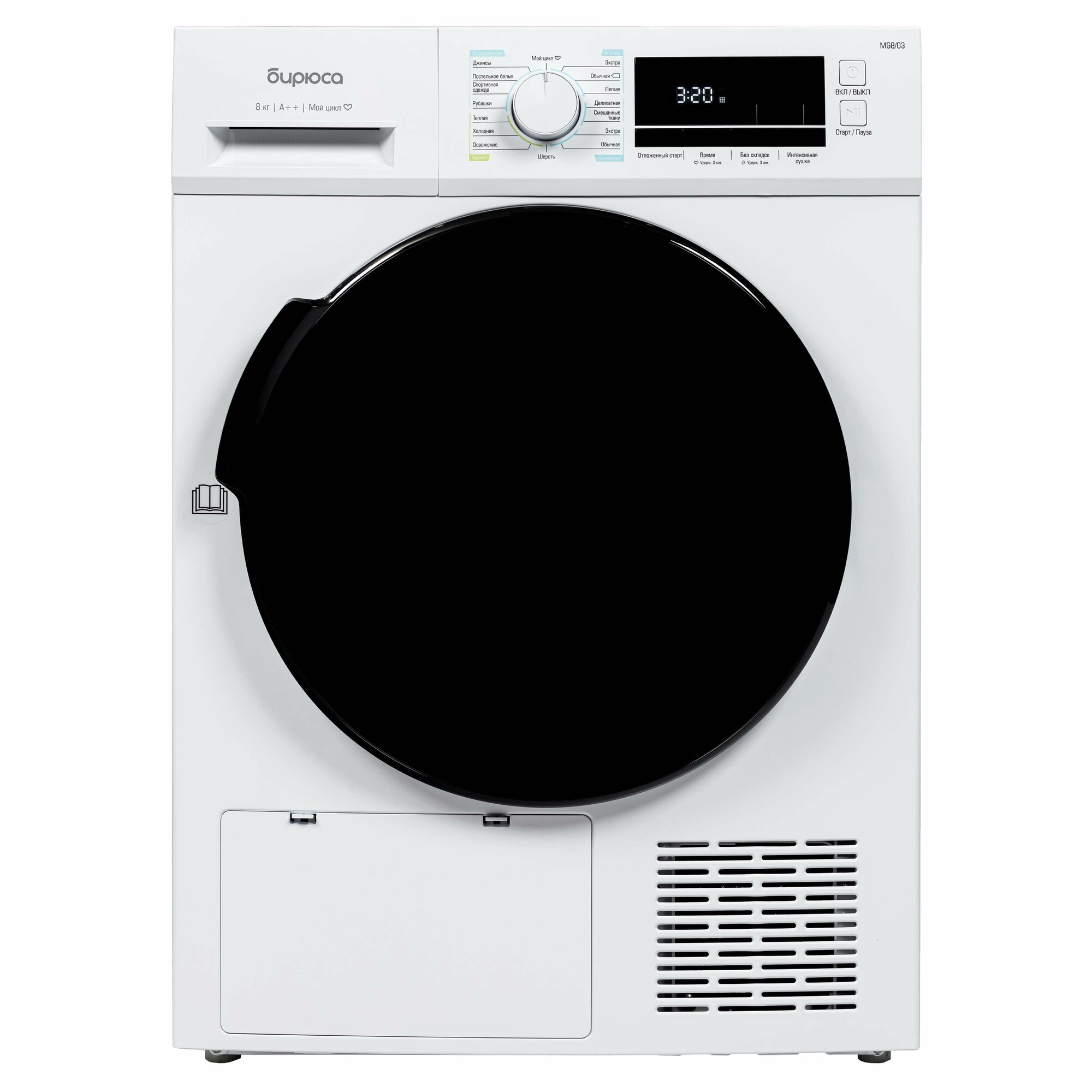 Купить Сушильная машина 8кг с тепловым насосом Heat Pump, с большим дисплеем, съемный фильтр, Бирюса DM-MG8/03, цвет Белый