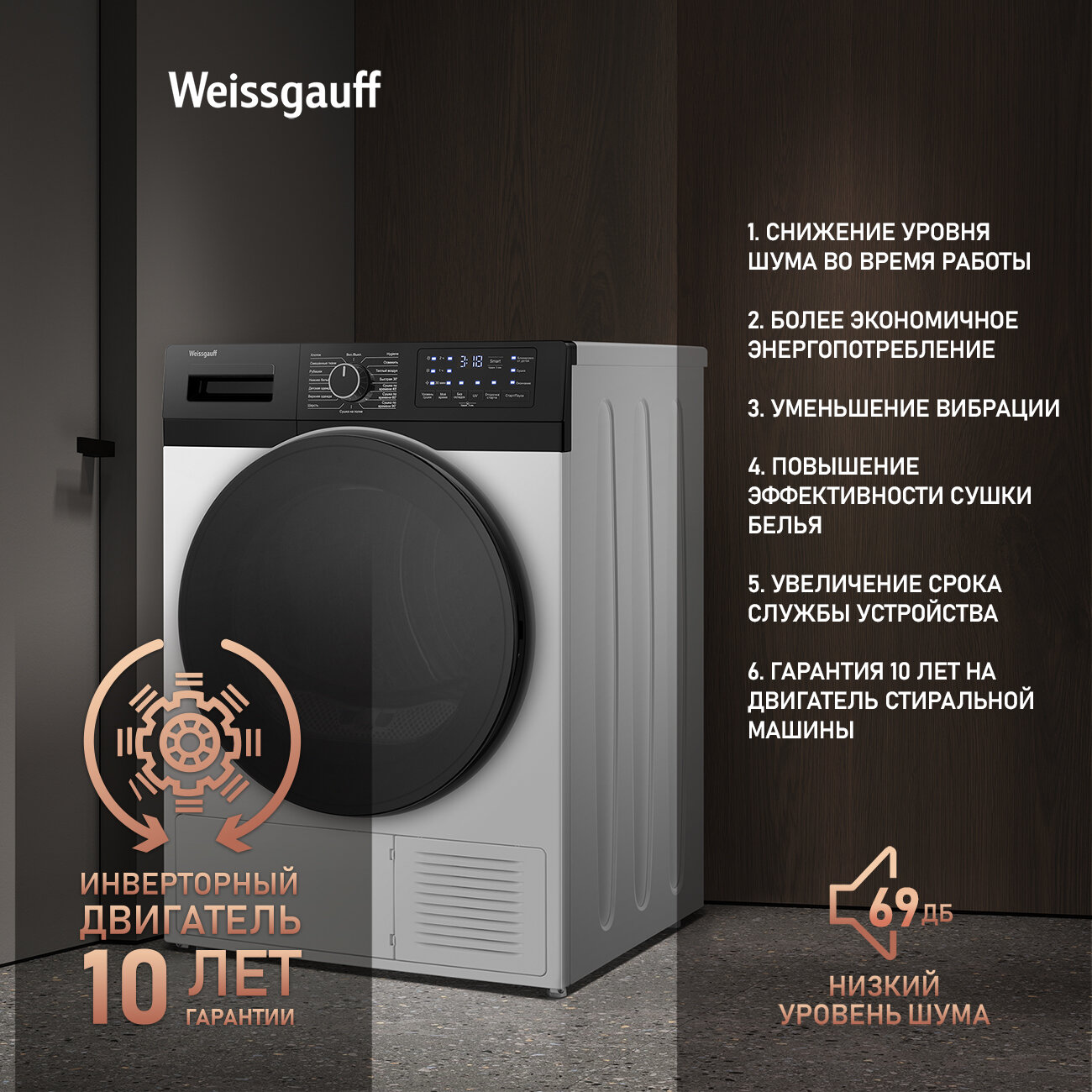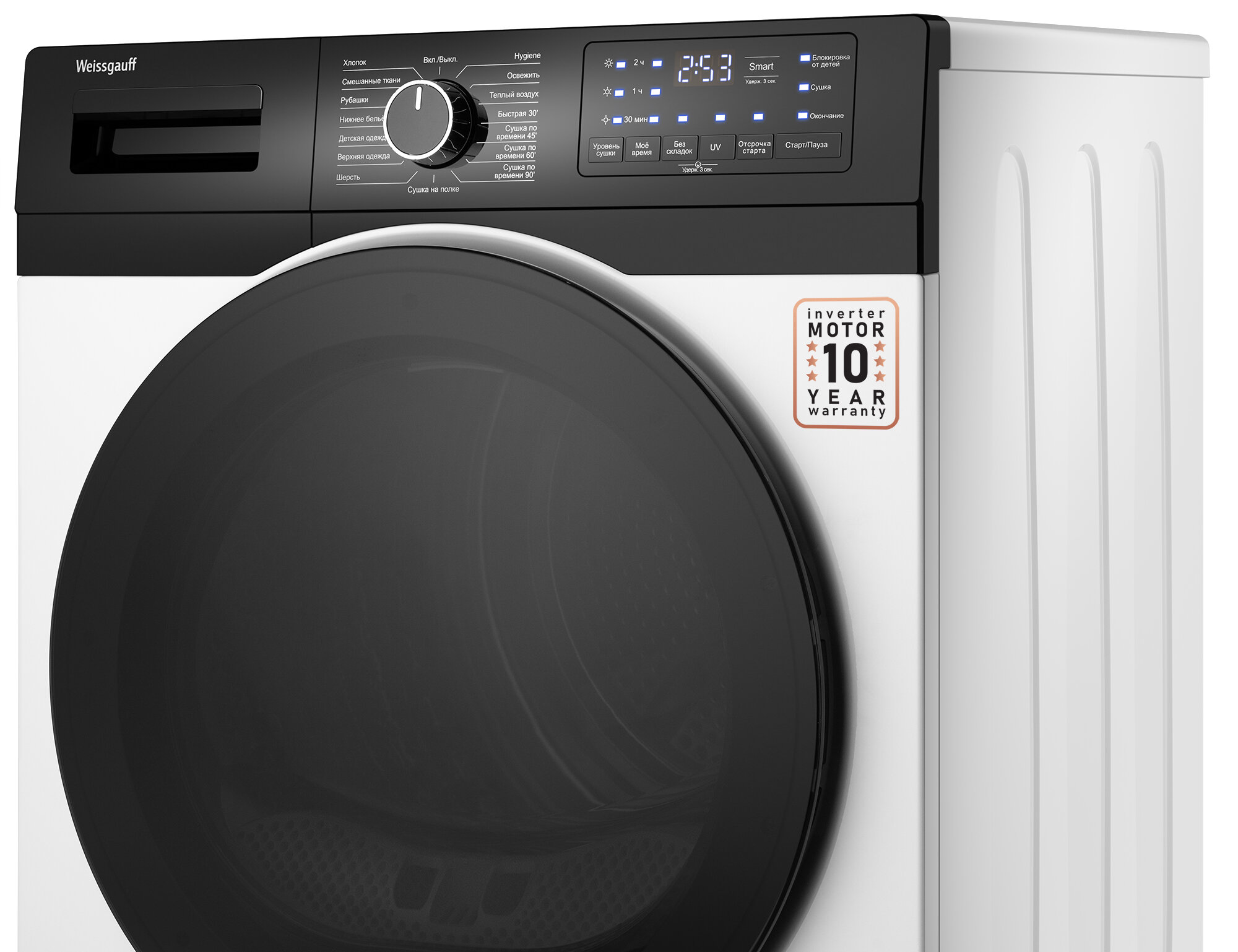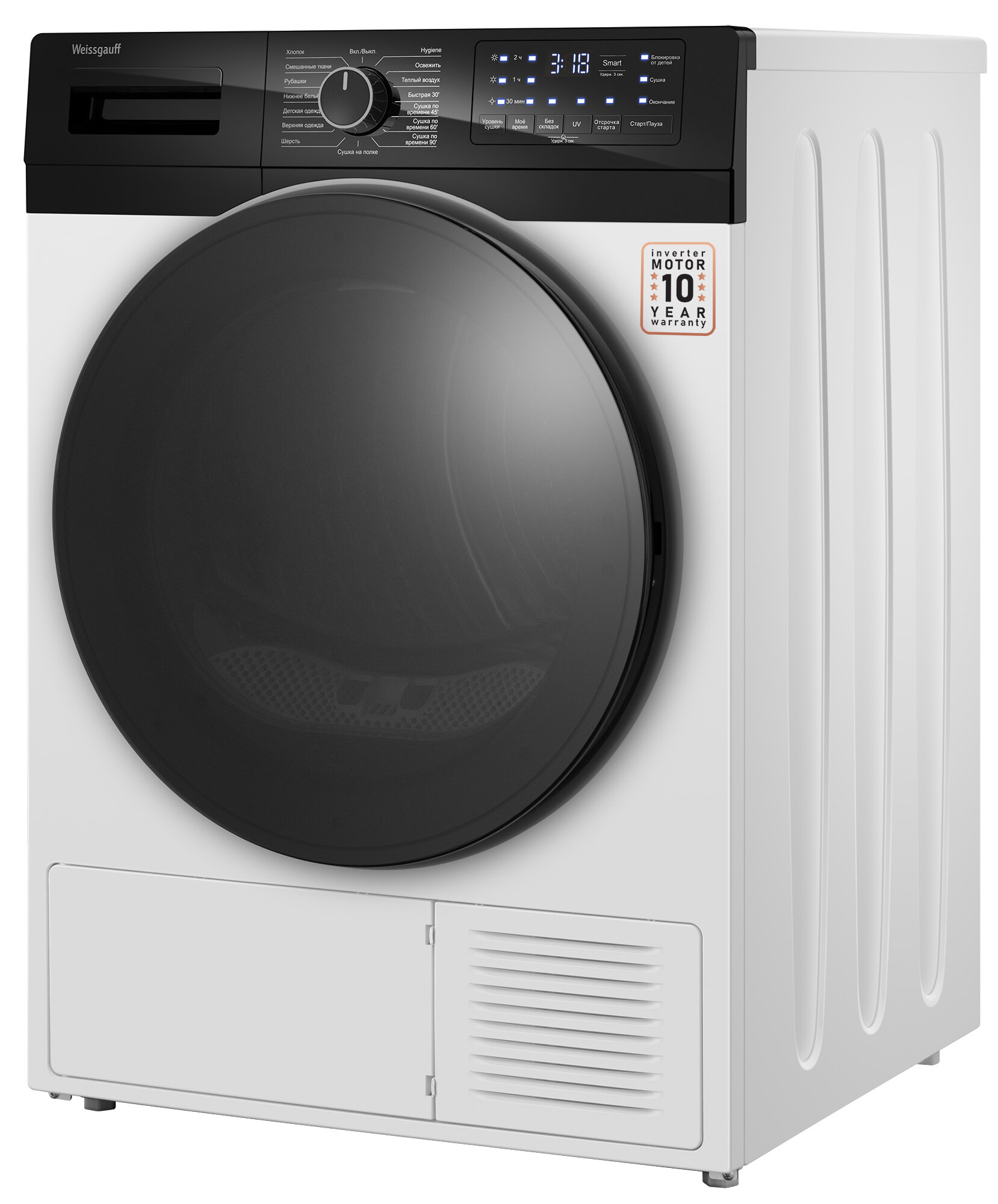 Сушильная машина с инвертором и ультрафиолетом Weissgauff WD 6110 B Heat Pump, 10 кг загрузка, 16 программ, А+ интересное: