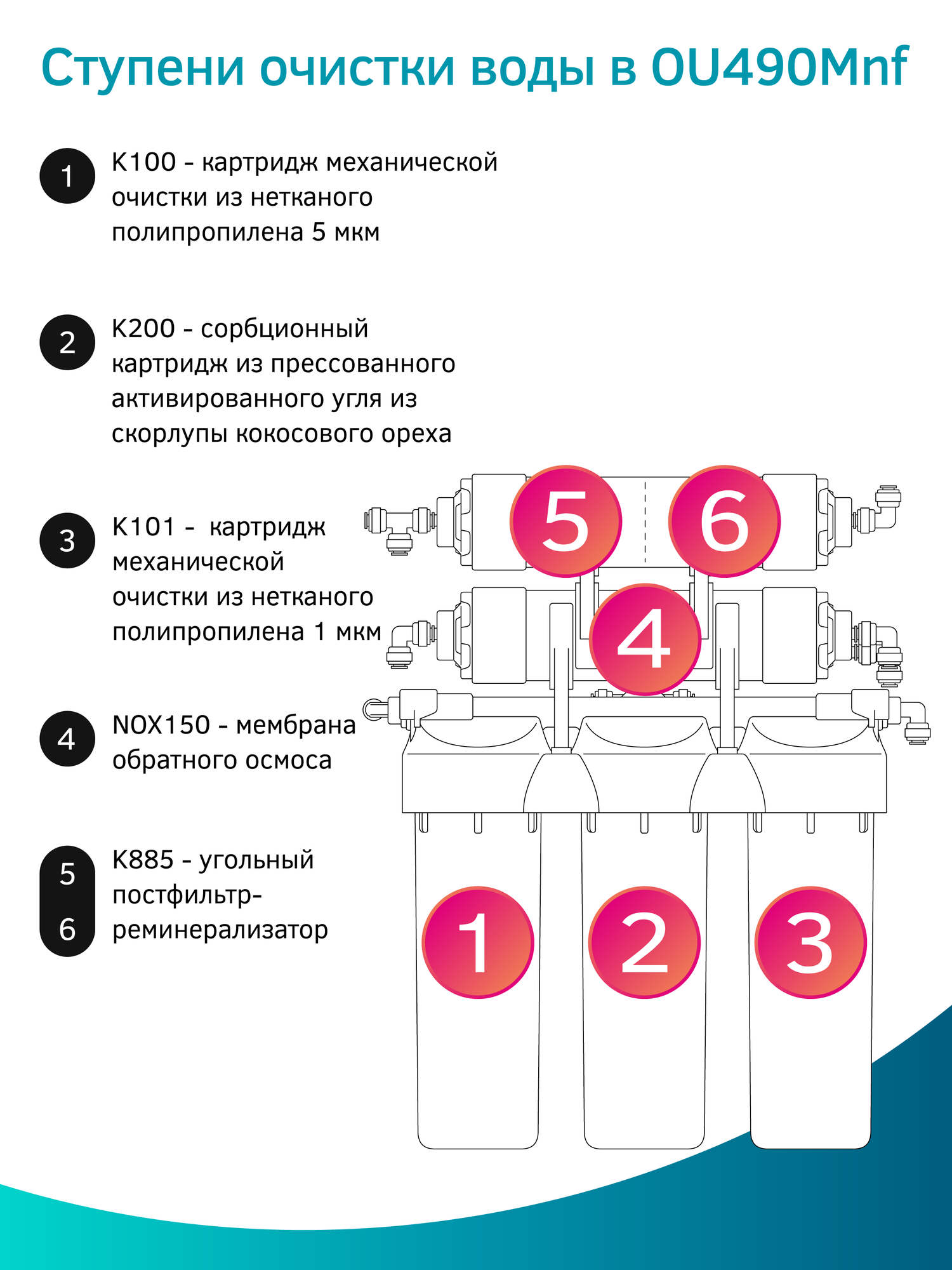 | Функции очистки | механическая фильтрация / обезжелезивание / обратный осмос / очистка от бактерий / очистка от ржавчины / очистка от свободного хлора / угольная фильтрация / ультрафильтрация / Защита от накипи / Очистка и минерализация воды / Тонкая очистка / Удаление аммония / Удаление бактерий / Удаление железа / Удаление марганца / Удаление механических загрязнений / минерализация |
