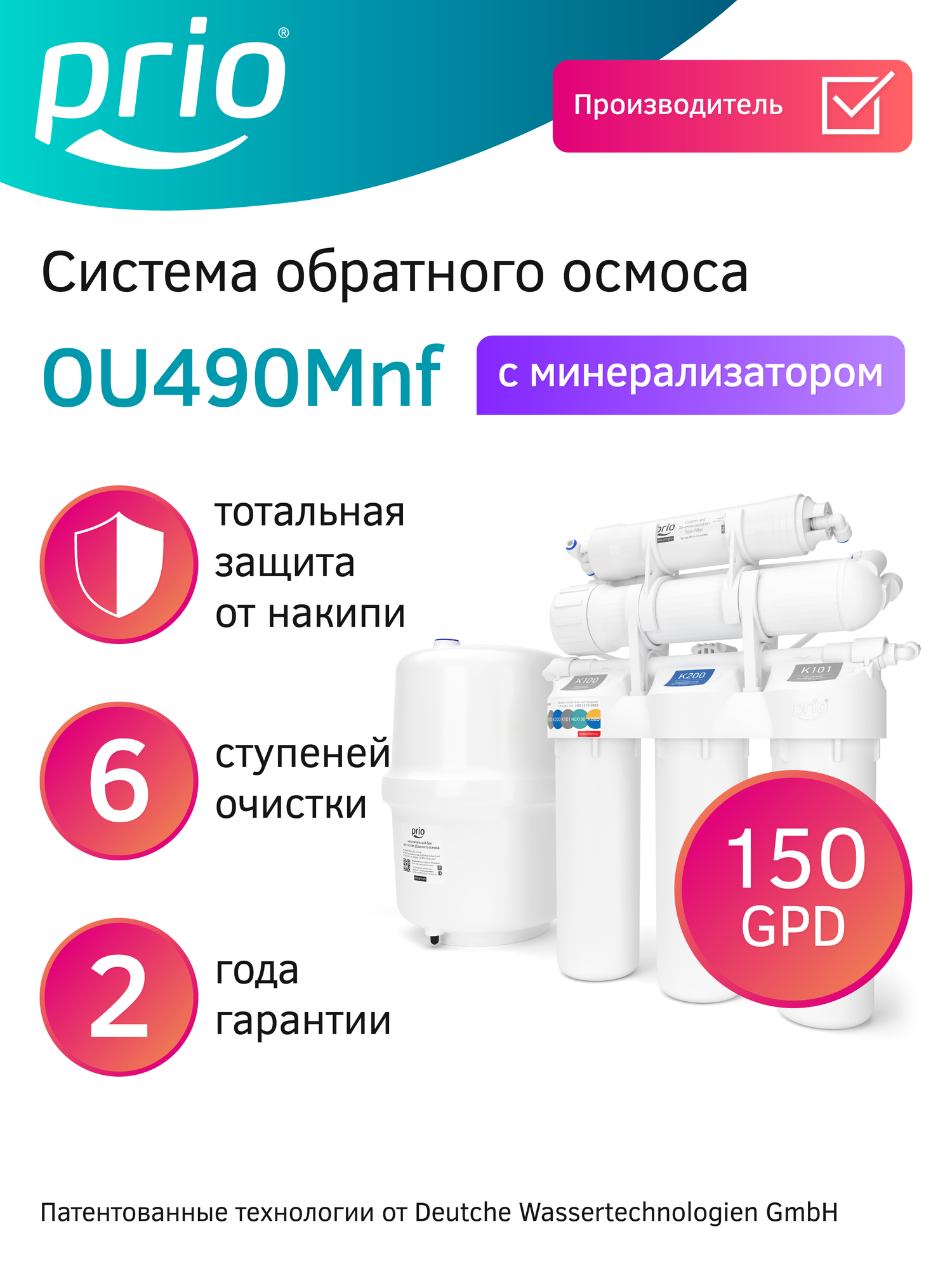 Фильтр для воды обратный осмос Prio OU490M с минерализатором, 150GPD, 6 ступеней