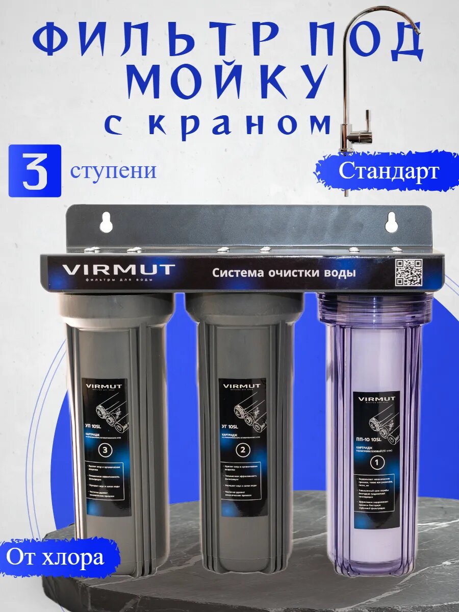 Купить Фильтр проточный под мойку с краном кухонный Трио Стандарт Virmut, универсальный фильтр воды под мойку