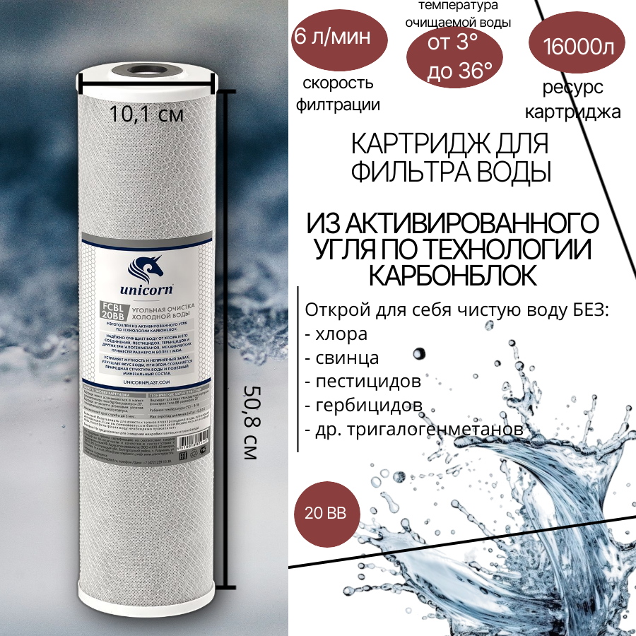 Картридж угольной брикет (с прессованным активированным углем) для фильтра воды FCBL 20ВВ Unicorn интересное: