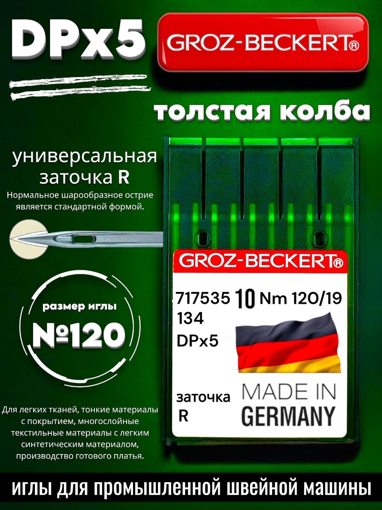 Иглы Groz-Beckert / Гроз-Бекерт DPx5 № 75. Для промышленной швейной машины, толстая колба